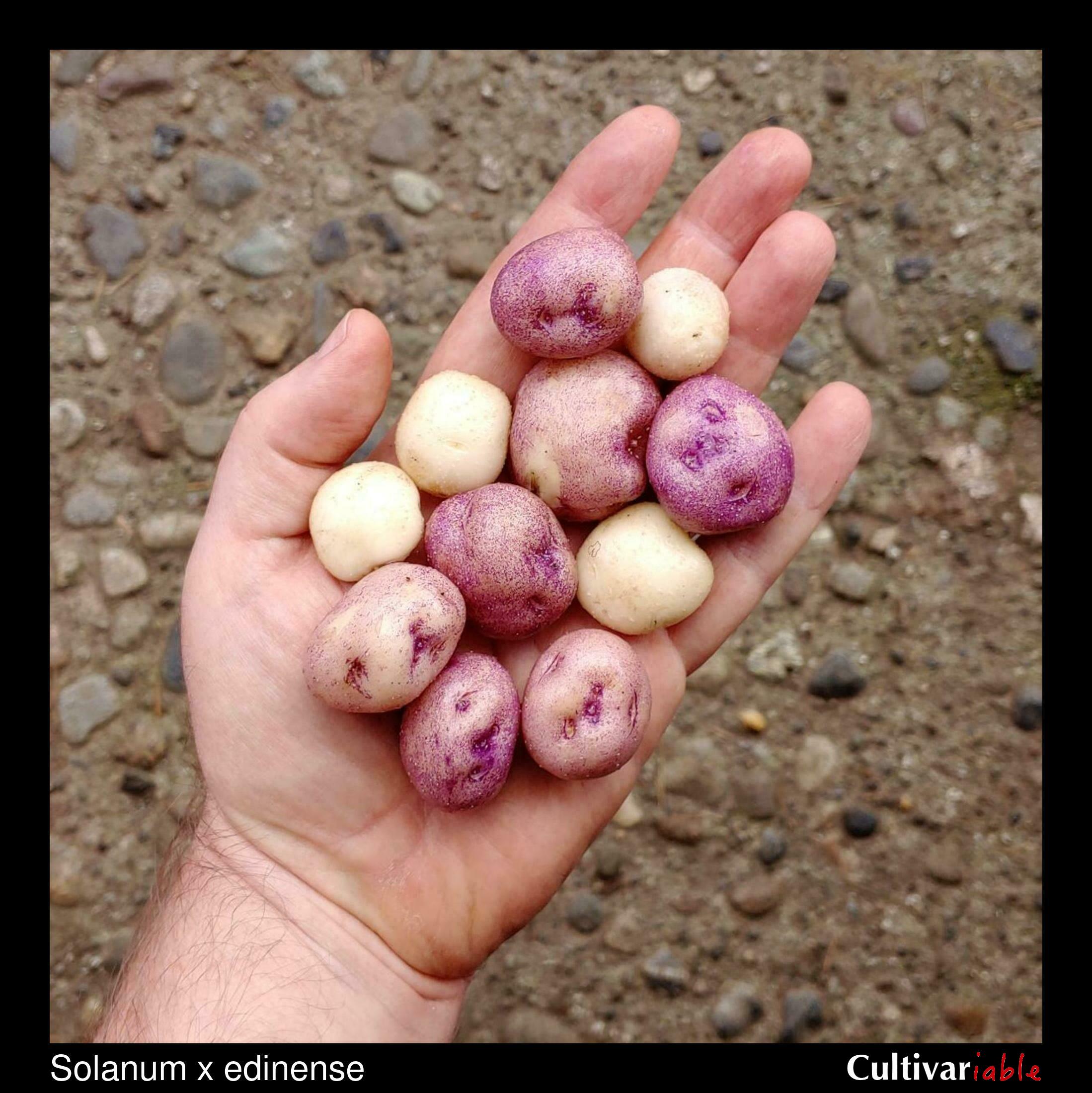 Solanum x edinense is a natural hybrid species from central Mexico, generally found in areas of potato cultivation. It is thought to be a cross of domesticated S. tuberosum x S. demissum. Plants range from three to six feet tall, more similar in form to domesticated potatoes than S. demissum. Flowers are typically blue, less commonly white. Berries are round, similar to the domesticated potato, but often seedless. Some clones appear to be male sterile, while others set small amounts of seed when self-pollinated. Tubers are small, usually less than an inch, and blue or white. The stolons are very long, reaching five feet or more in some accessions.