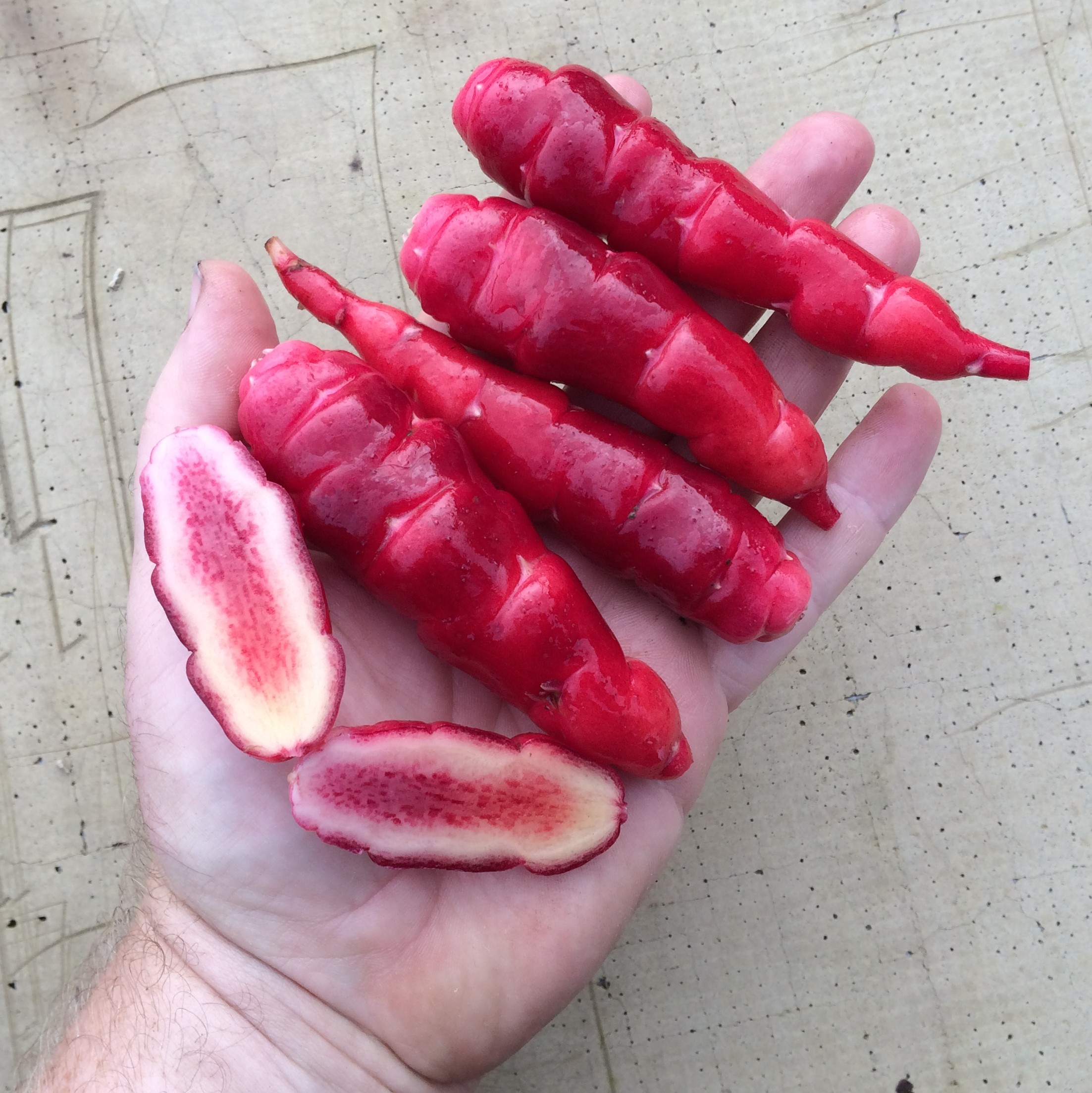 As far as I know, the first harvest from a seed grown oca plant on this continent. Although we never sold this variety, I kept it for a long time before we finally lost it in last year’s flooding.