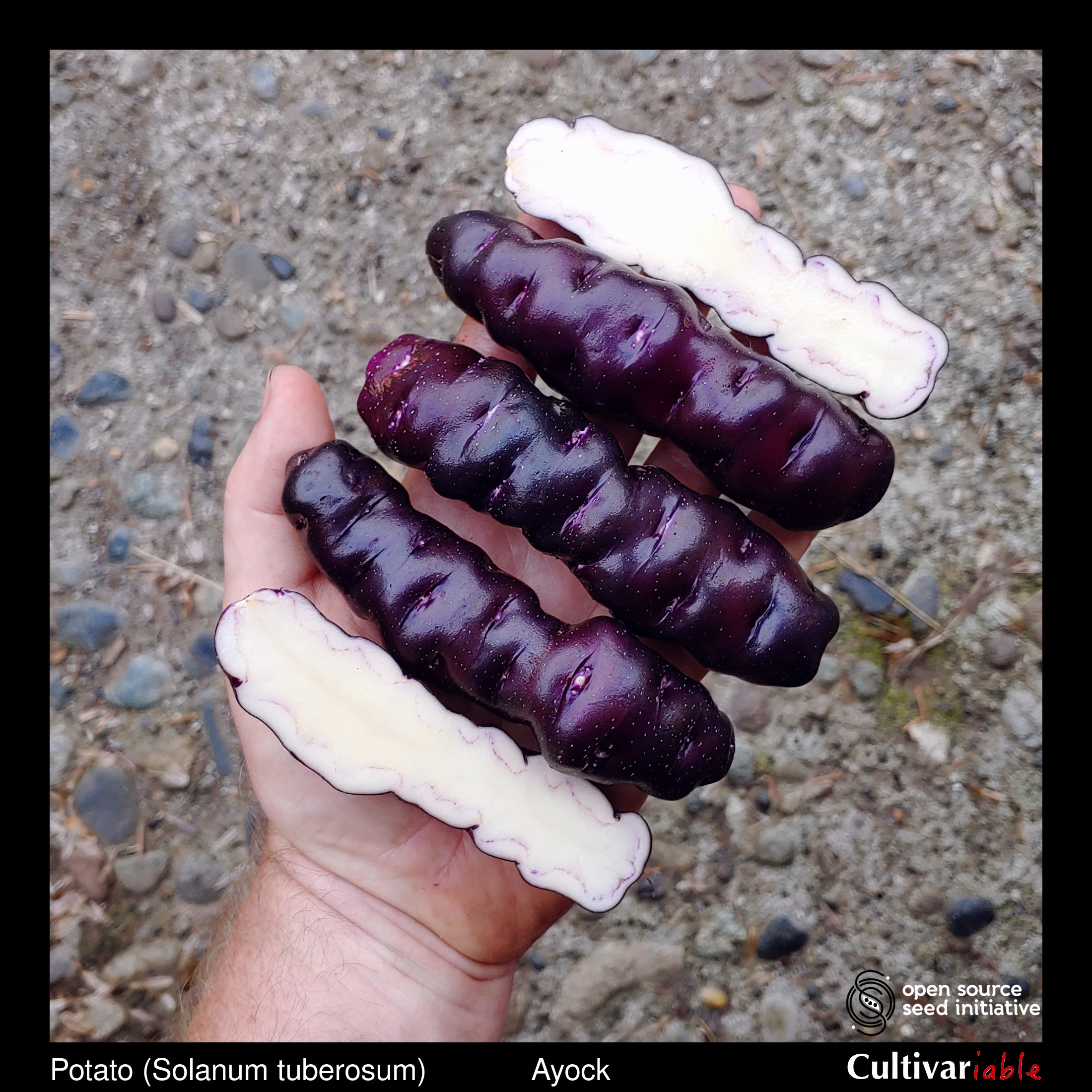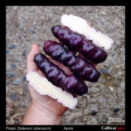 Ayock PotatoAyock is a spectacular looking purple fingerling, selected from high dormancy diploid potatoes. It is not a top yielder, but it produces reliably by mid-season, and has excellent dormancy, so it would be a good potato to try if you are looking to experiment with diploid potatoes as it doesn’t require extreme measures to grow or store. Both tubers and TPS are available. |