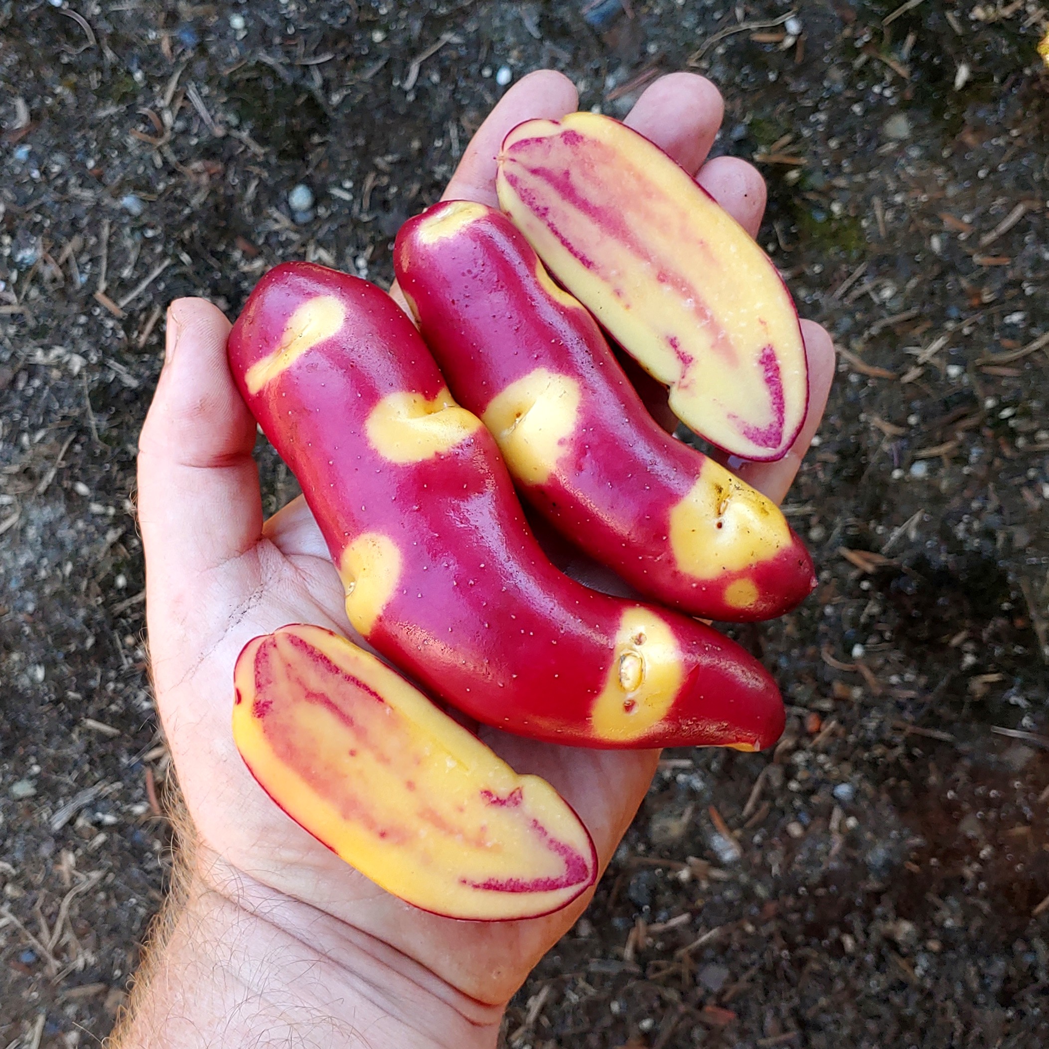 Bloody Banana PotatoBloody Banana is a pretty spectacular diploid potato with red and yellow skin and intense yellow flesh with a bit of red. It is a starchy potato with a rich flavor and I’m pretty happy with it. It has reasonable dormancy, but not as much as most tetraploids, so it is probably suited better to coastal climates than inland. Tubers will be available next year, but TPS is available now. Thanks to customer Wes Tucker for the name! |
