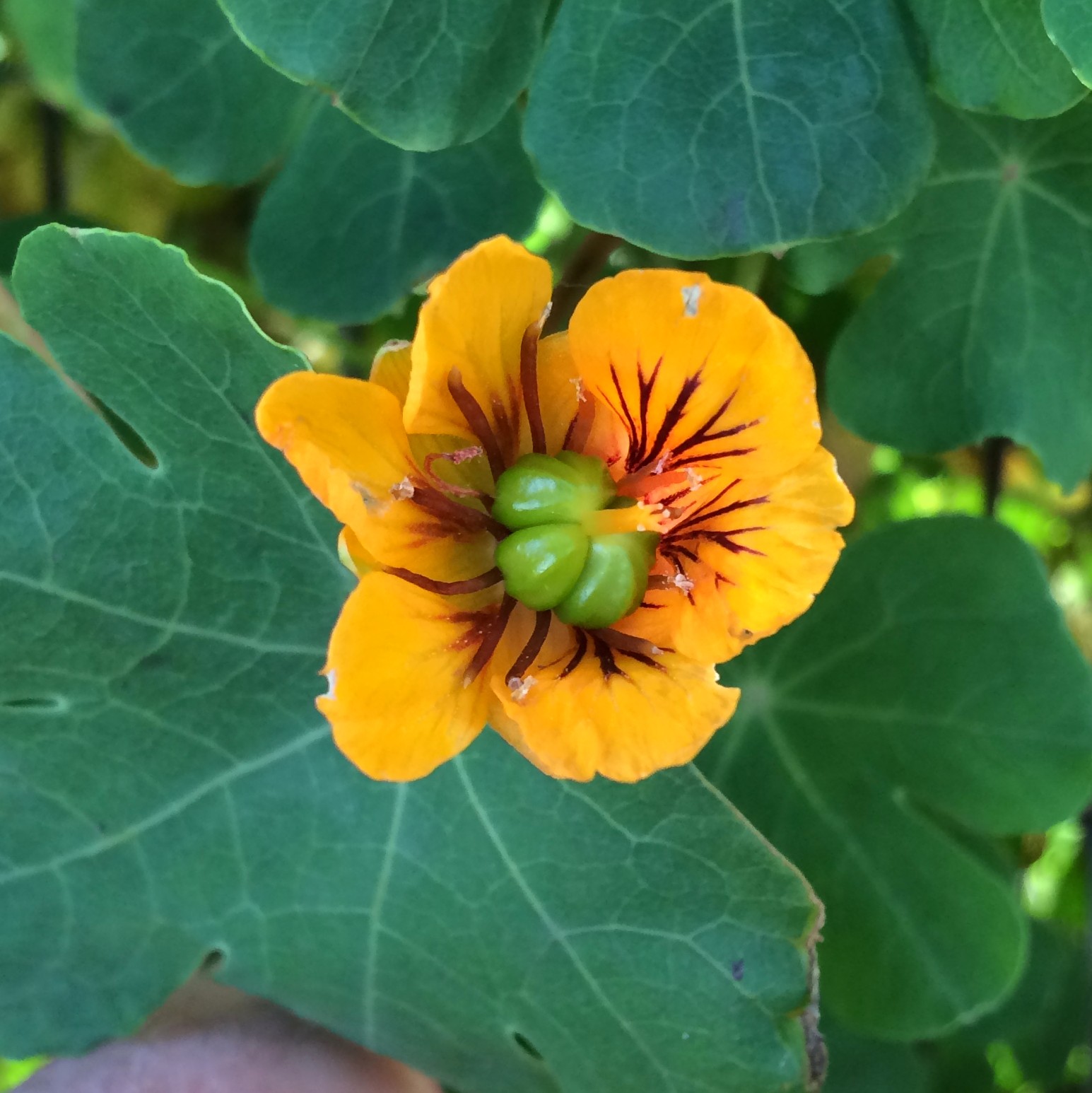 Mashua has long twining stems on which three to five lobed leaves form. In the fall (or mid to late summer for less common day neutral varieties), mashua forms trumpet shaped orange, orange and yellow, or occasionally red flowers.