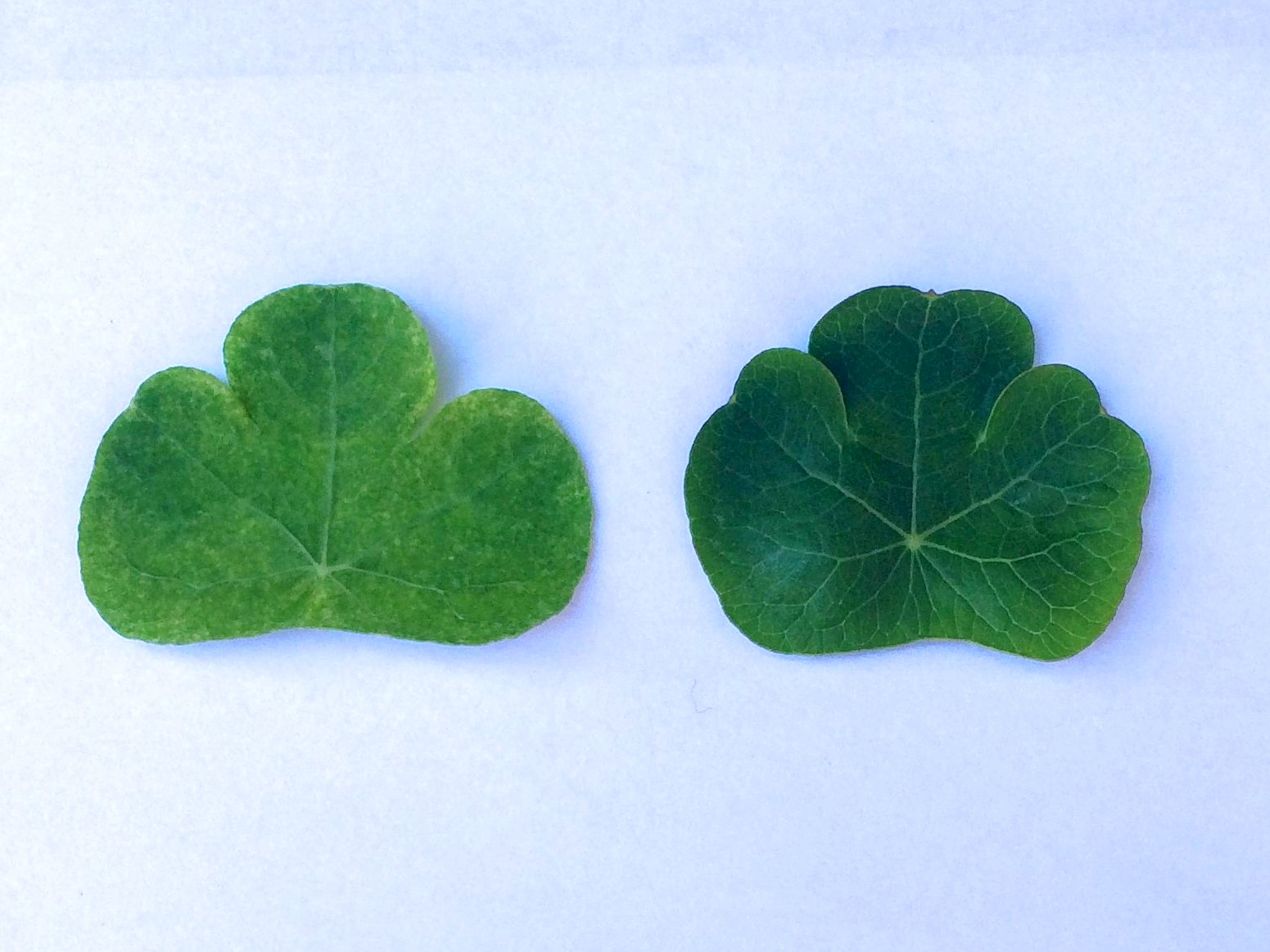 Mashua varieties in North America frequently test positive for a Potyvirus, which could be Bean Yellow Mosaic Virus, Mashua Virus Y, Tropaeolum Mosaic Virus, Turnip Mosaic Virus, or as yet unidentified mashua viruses. Plants that test positive for this virus usually show a fine, light mosaic on older leaves, but a few varieties develop much more severe symptoms, like those shown in the picture. This virus was present in the varieties Blanca, Ken Aslet, and Sapu-anu, but was mostly asymptomatic except when plants were under stress. Any variety that was grown in the same area as these in the past should be assumed to be infected, whether it shows symptoms or not.
