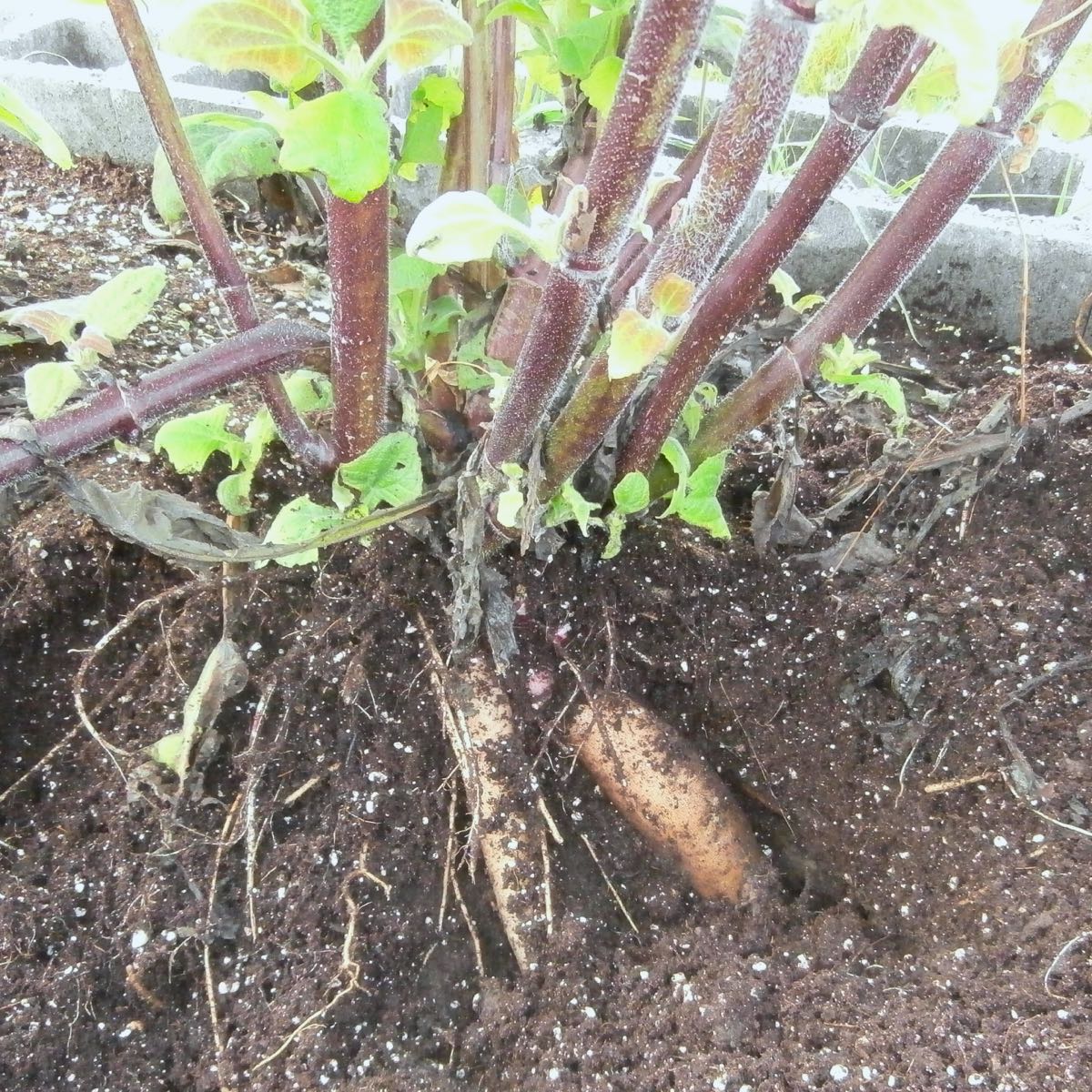 With some engineering, you can grow yacon as a permanent perennial, harvesting part of the crop of storage roots, but otherwise leaving the plant undisturbed. You can do this by growing the plant in a mound at least two feet tall, so that you can dig in from the side, underneath the rhizome to remove the storage roots. A concrete block bed works very well, because you can easily remove the wall on one side and then the other for greater access to the roots. Is all this effort worthwhile? You’ll have to decide that.