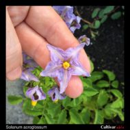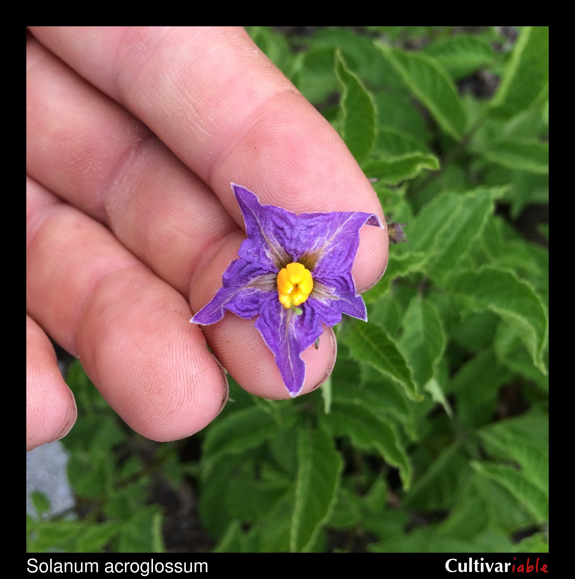Solanum acroglossum is a wild potato species from Peru. Plants are generally a bit smaller than domesticated diploids, with sparser foliage. Tubers are very unusual, with alternating swellings and restrictions, like beads on a string (the technical term is moniliform). Flowers light blue. It is found at elevations from about 8,200 to 12,100 feet (2500 to 3700 meters) (Ochoa 2004).