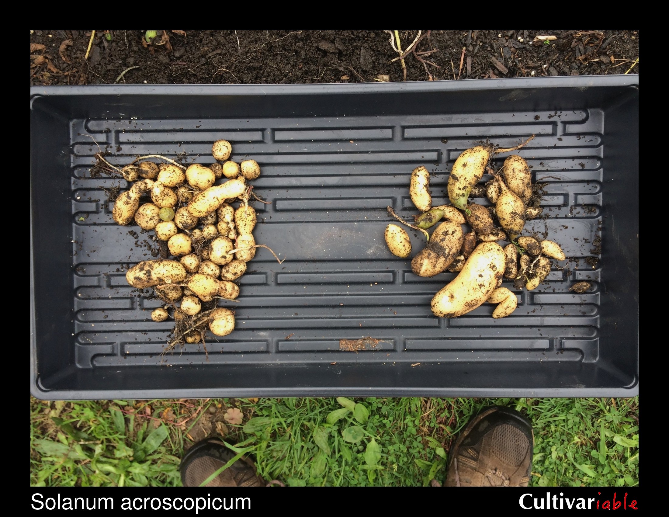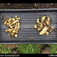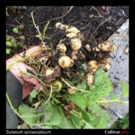 Tetraploid of this species (or at least those accessions that I have grown) tuberize under long day conditions and many of the tubers are clustered tightly around the base of the plant. Spring sown plants began to senesce in August and yielded about 8 ounces of tubers per plant.