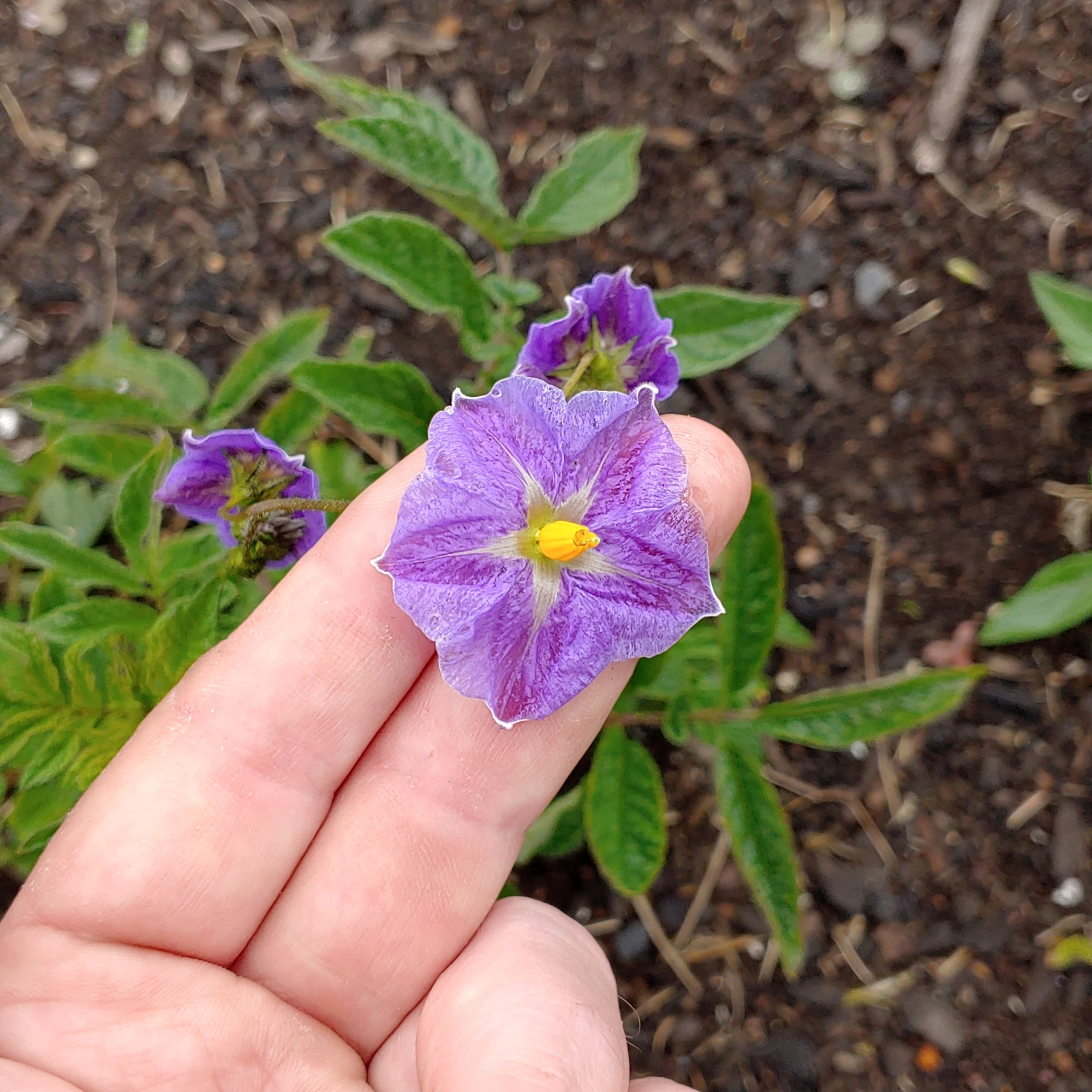 Good germination and moderately strong seedling growth. Stems light to dark purple. Flowers mostly dark blue, some light. Collected in Arequipa, Peru, at the same site as PI 365315. Hosaka (2012) found that this accession has W type cytoplasm. It is pretty interesting that these two very similar accessions collected in the same area have different cytoplasm types. Largest tubers of the three diploid accessions.