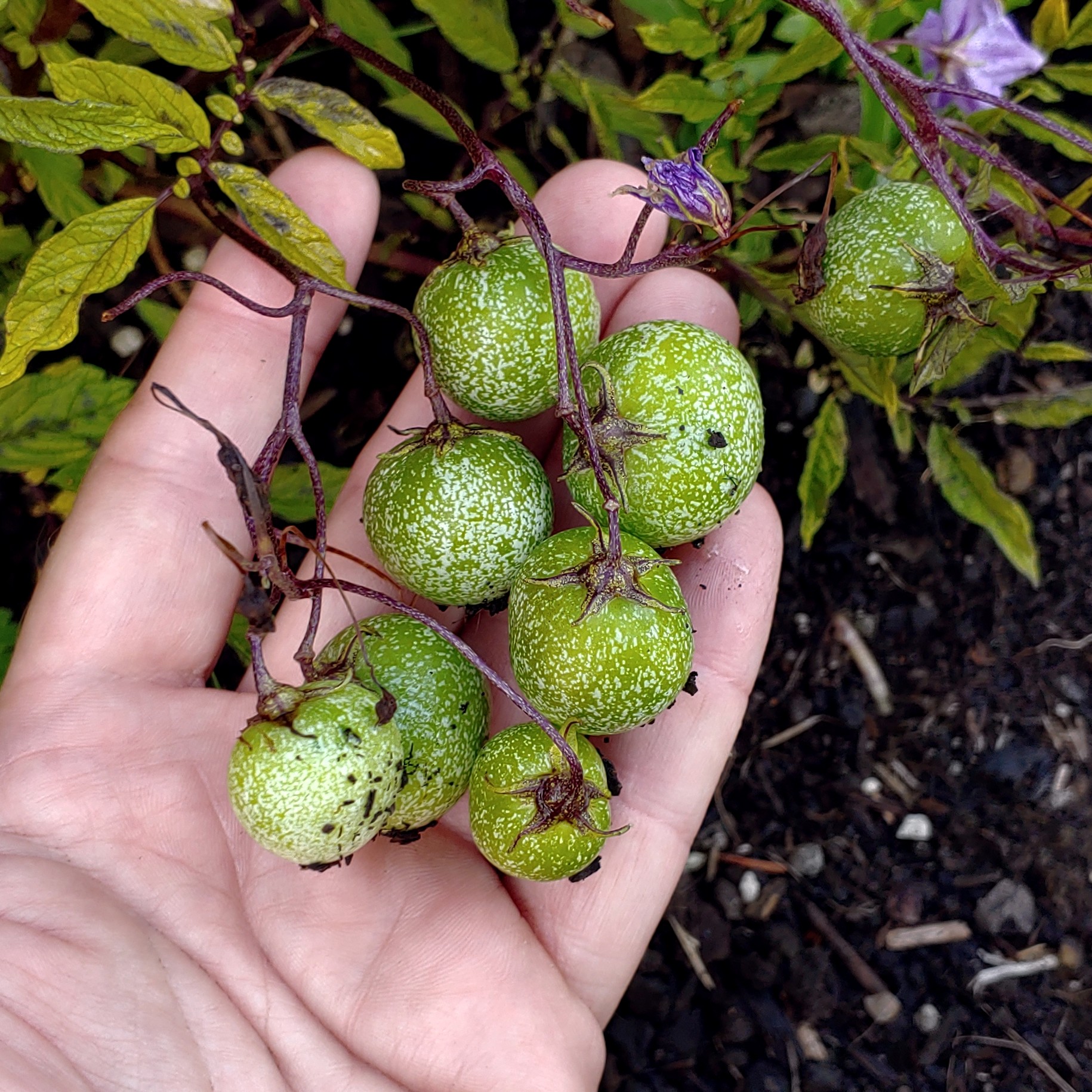 I have found no accounts of glycoalkaloid content for this species, other than a brief mention that glycoalkaloids are low (Kiru 2008). I tasted freshly harvested tubers and found them pleasant and nearly indistinguishable from domesticated potato. Among the diploids, most have some mild sourness to the skin and perhaps a third have a bit of sourness in the flesh. With those odds, it is very easy to select palatable varieties. This is probably good evidence that the TGA content is at least close to the safety zone, but there is no guarantee that this species does not contain other toxic components. In the tetraploids, I was surprised to find that even tubers that were partly exposed and greened had no detectable bitterness. I have now eaten several large portions of my selections from this species with no apparent ill effects. While I wouldn’t feel comfortable declaring it completely safe to eat, I think it is very close to that.