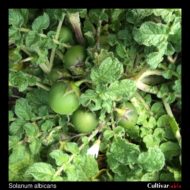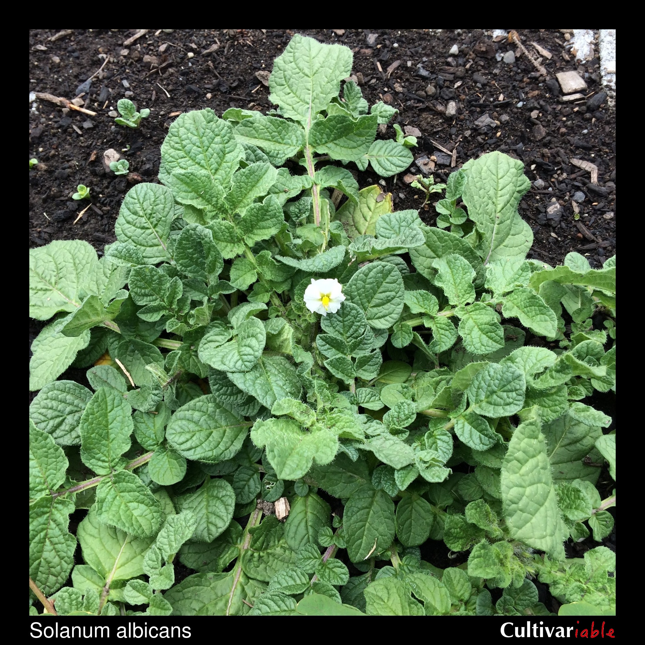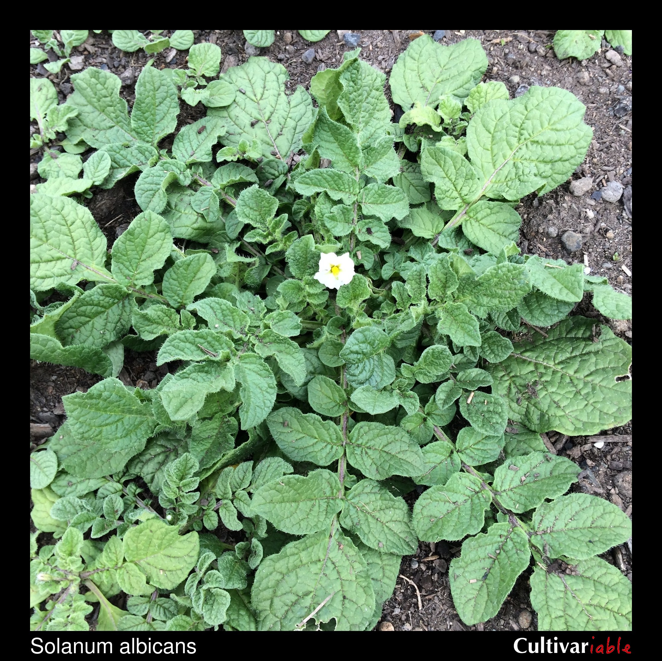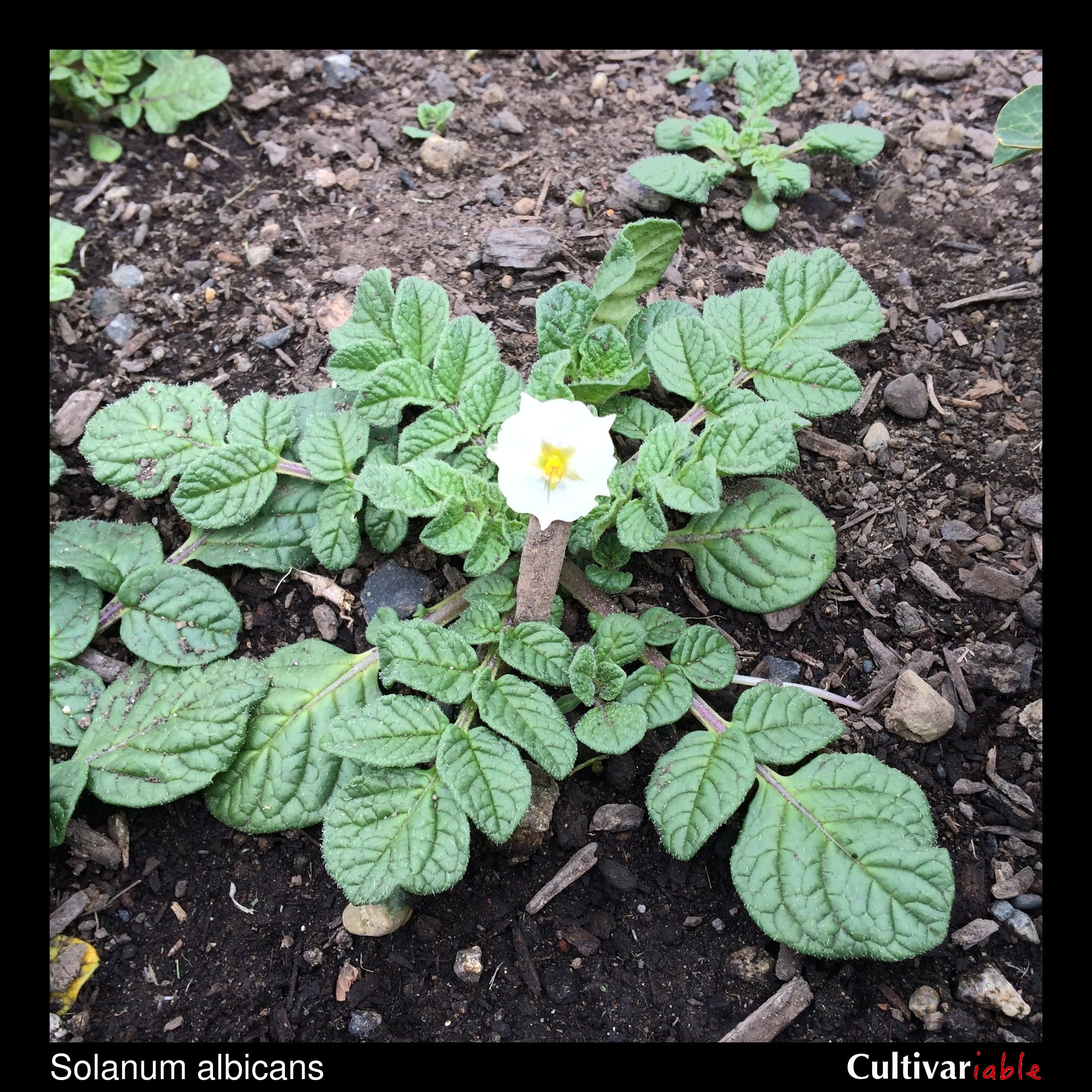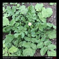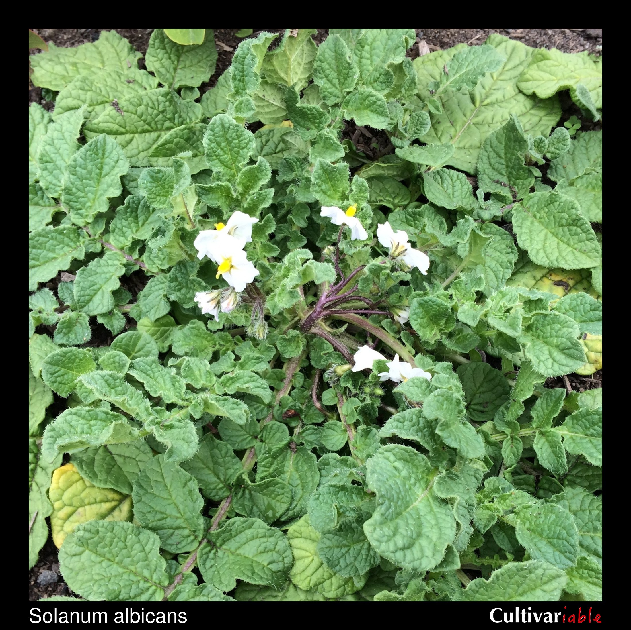 Solanum albicans is a hybrid species that is similar in many ways to Solanum acaule, one of its putative parents.  Ochoa (2004) believes it to be a cross of S. acaule x S. sogarandinum, while Hawkes (1990) believes the male progenitor to be S. cajamarquense.  It takes the form of a low-growing rosette, but is a little bit larger than S. acaule.  Stolons run about 10 to 15 inches in length and often act as runners, being very shallow and forming new plants at nodes.  Tubers are mostly round and 1/2 to 1 inch in diameter.  Flowers are mostly white to light blue, occasionally darker.  Fruits are round.