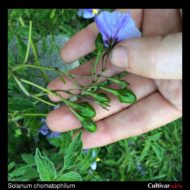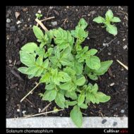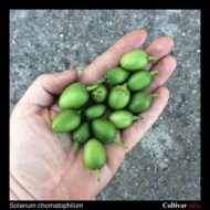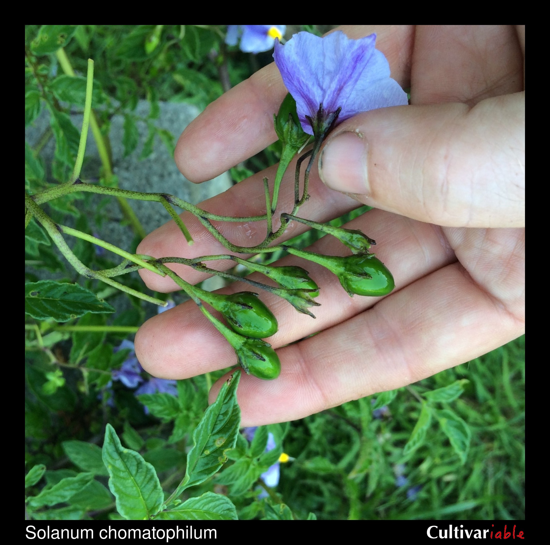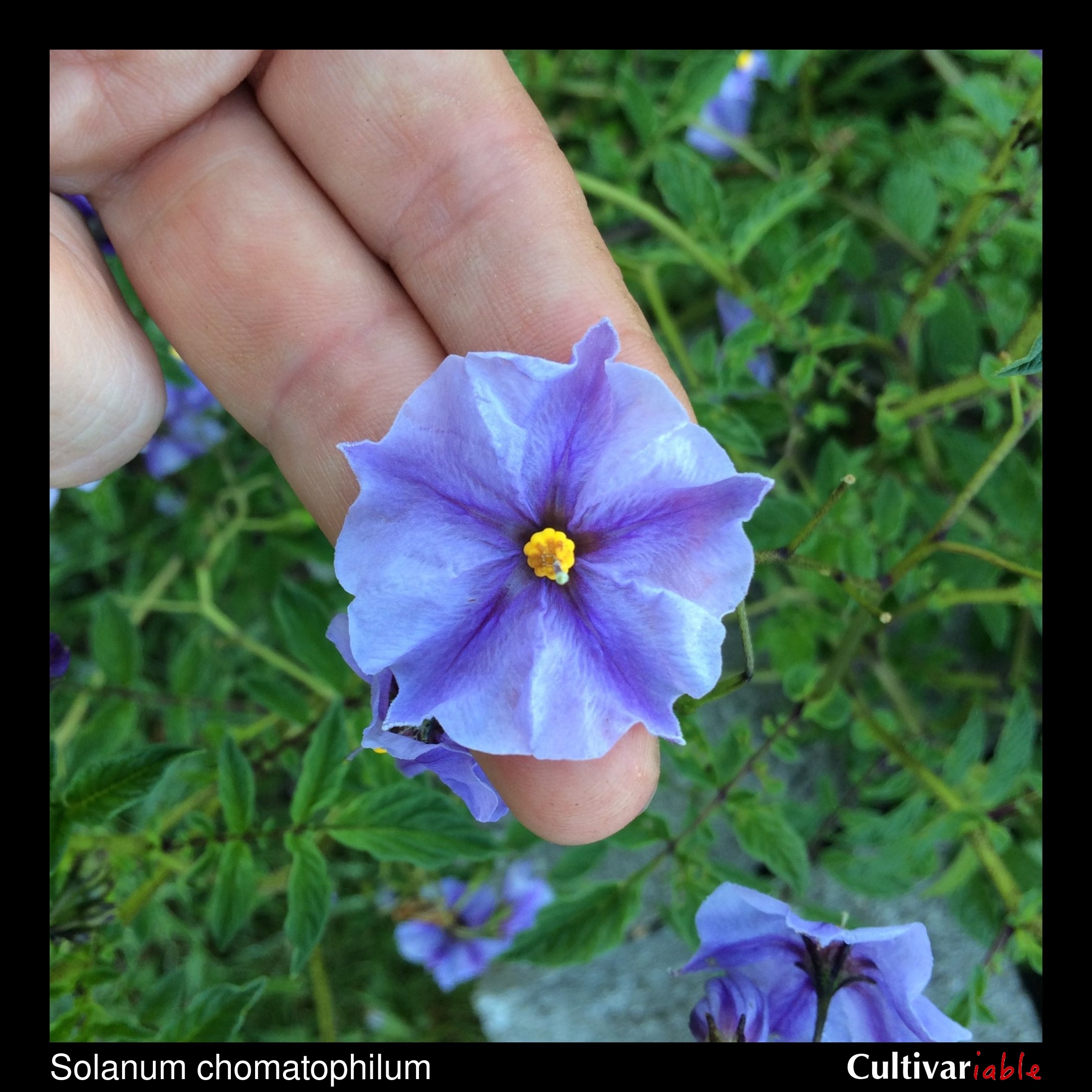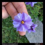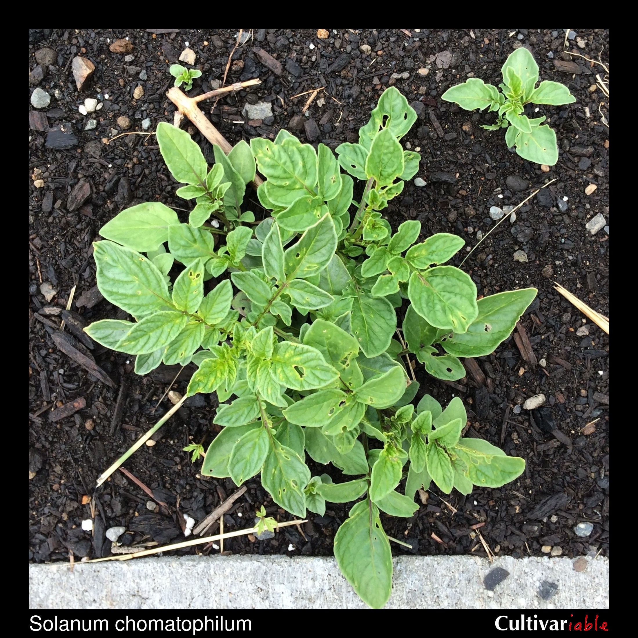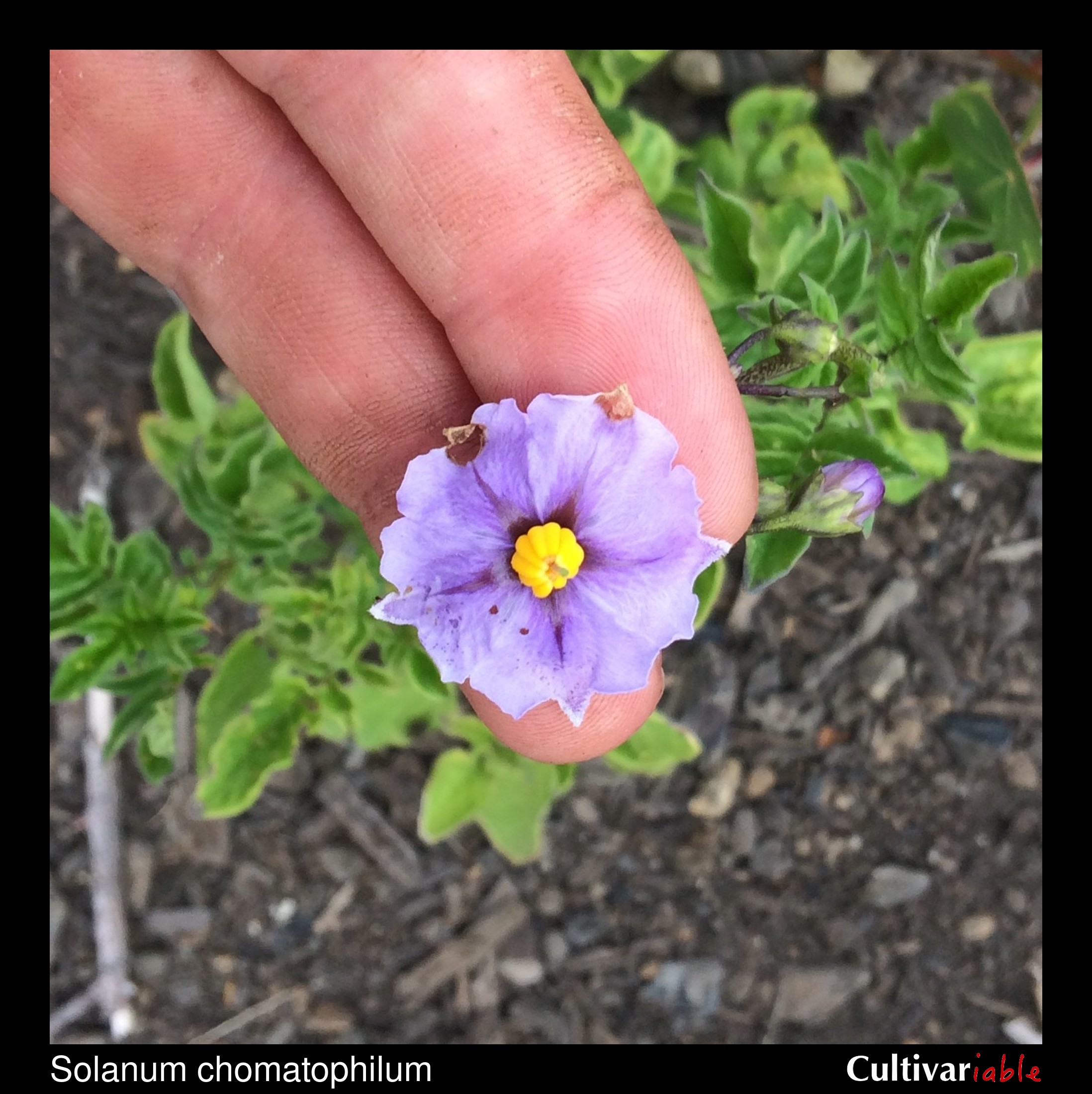 The specific epithet, chomatophilum, means something like “tending to be grooved,” or, I suppose, “groovy.” We could call it the groovy nightshade. The name is formed from the Greek words “choma,” for “groove,” and “philein,” for “to love.” While there is no completely standardized pronunciation for scientific names, the most common way to pronounce this species is probably so-LAY-num koh-mah-TOH-fil-um.
