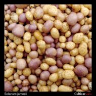 S. jamesii tubers are small, rarely reaching an inch in diameter and perhaps twice that for elite selections under cultivation. Plants grown at Cultivariable have produced an average of 102 tubers, with a average total yield of 66 grams and an average tuber weight of 0.67g, which is 678 tubers per pound or 1492 tubers per kilogram. The highest average tuber weight that I have seen is 3.45 grams and the largest tuber I have seen was 20.4 grams. The tubers are usually white to tan, turning purple with full maturity or exposure to light, as happens with many North American species. They are formed on long stolons that range from a few inches to about two feet long, with most plants having stolons on the longer side of that range. Tubers can remain dormant for very long periods. Bamberg (2010) found that tubers of many collections would store successfully at 41 degrees F (5 C) for eight years and recounted a story from a landowner who observed plants growing on resumption of irrigation after 39 years. While 39 years seems intuitively unlikely, the upper limit for dormancy in S. jamesii remains unknown and it will be a long wait for the report if they do turn out to last 39 years under controlled conditions!
