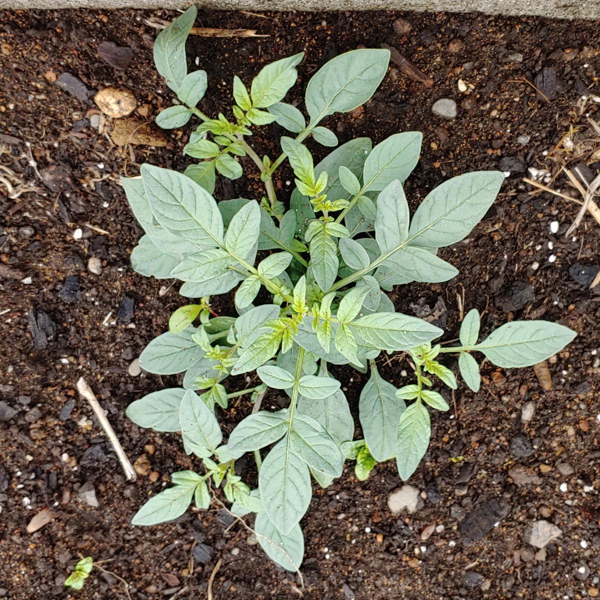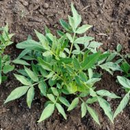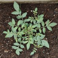 Early but low germination (16%). Some seedlings with unusually short internodes. Foliage green, some with broad leaflets. Plants mid height. Low late blight. Low early blight.