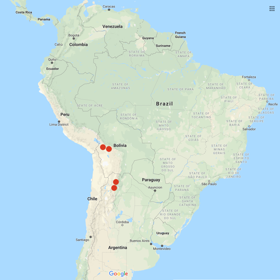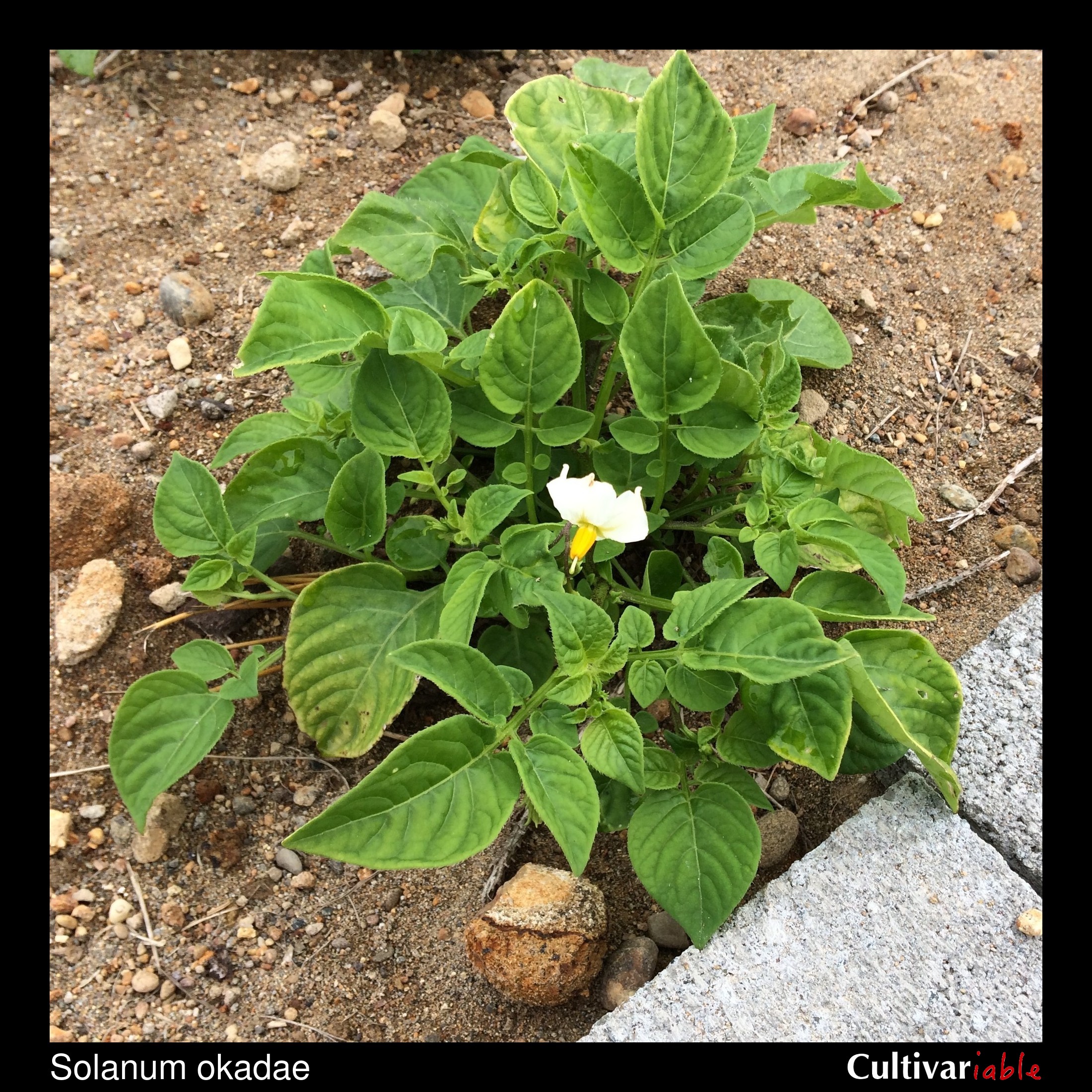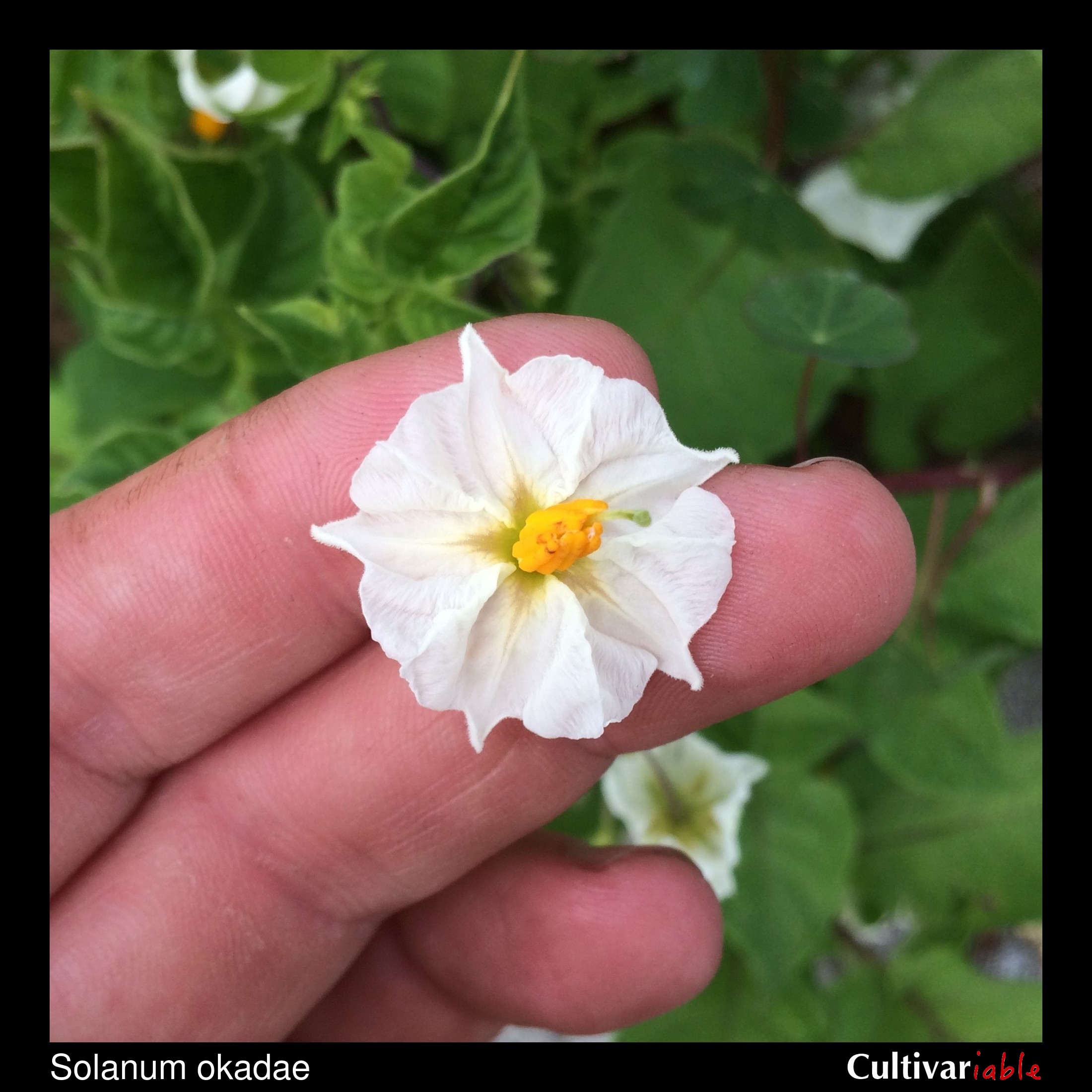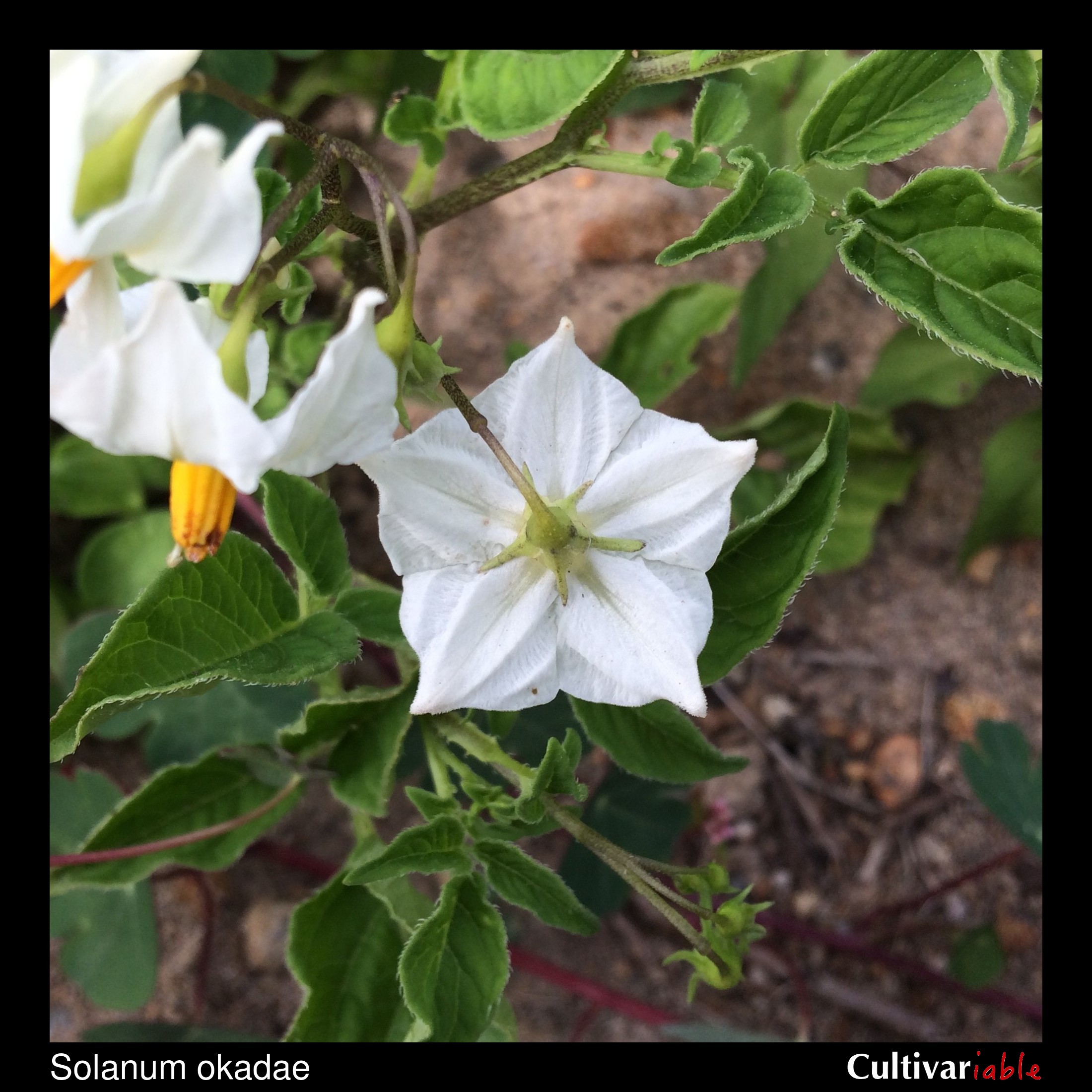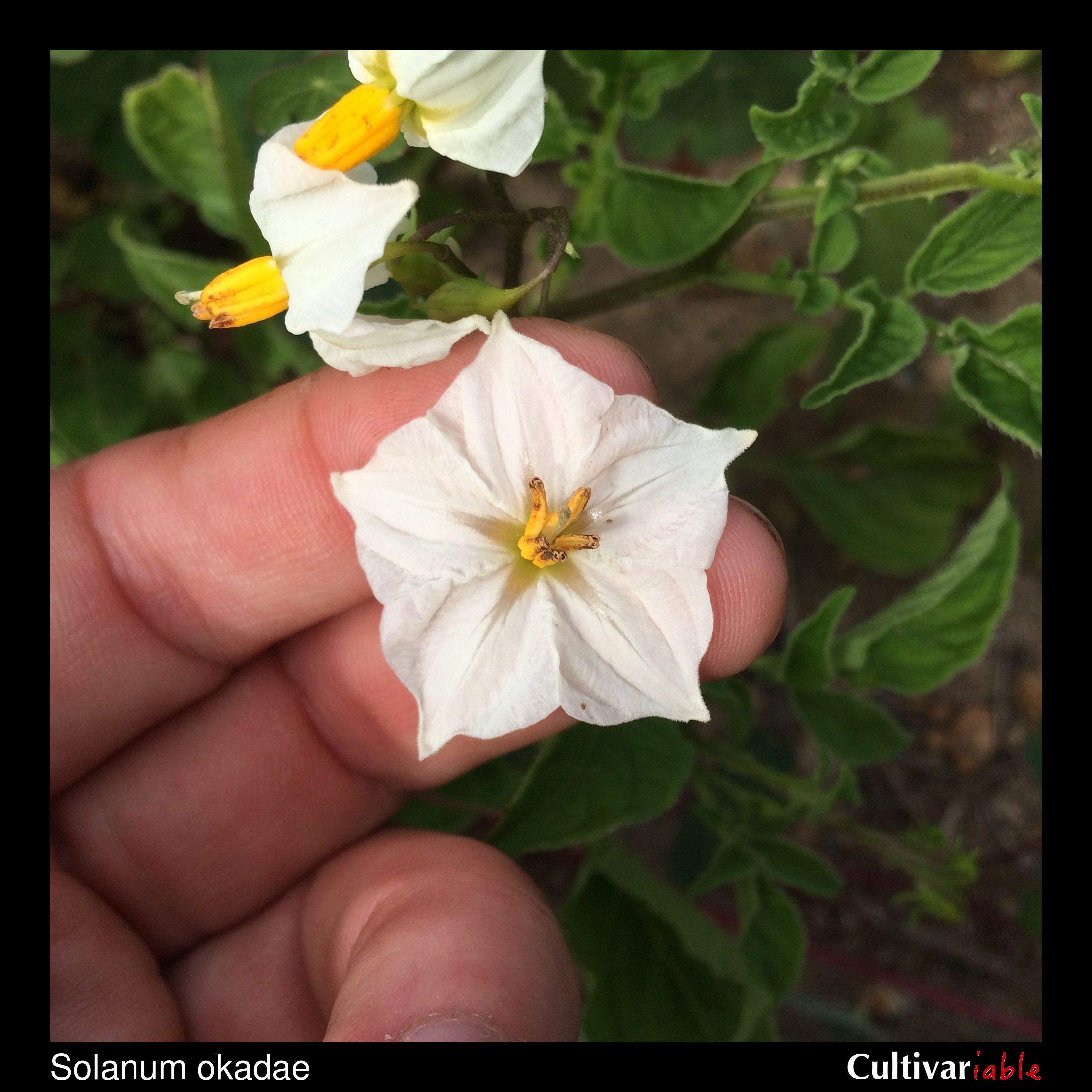 Solanum okadae is primarily a western Bolivian species, ranging south into Argentina, growing in moist mid-elevation habitats. Plants about a foot tall. Stolons two feet long or more. Tubers round to ovoid, reaching about an inch in diameter. Flowers white. Berries round and a little more than 1/2 inch in diameter.