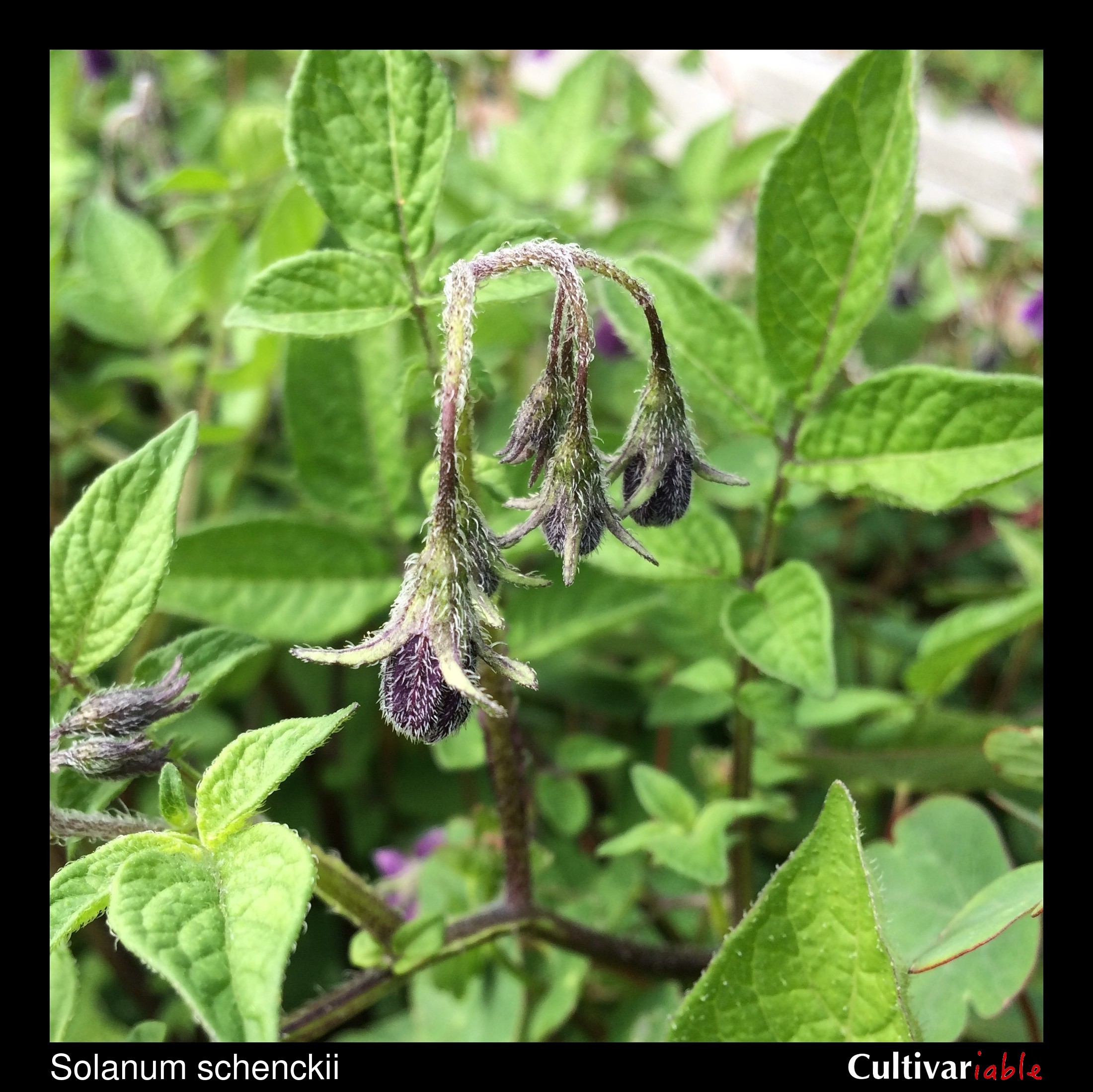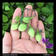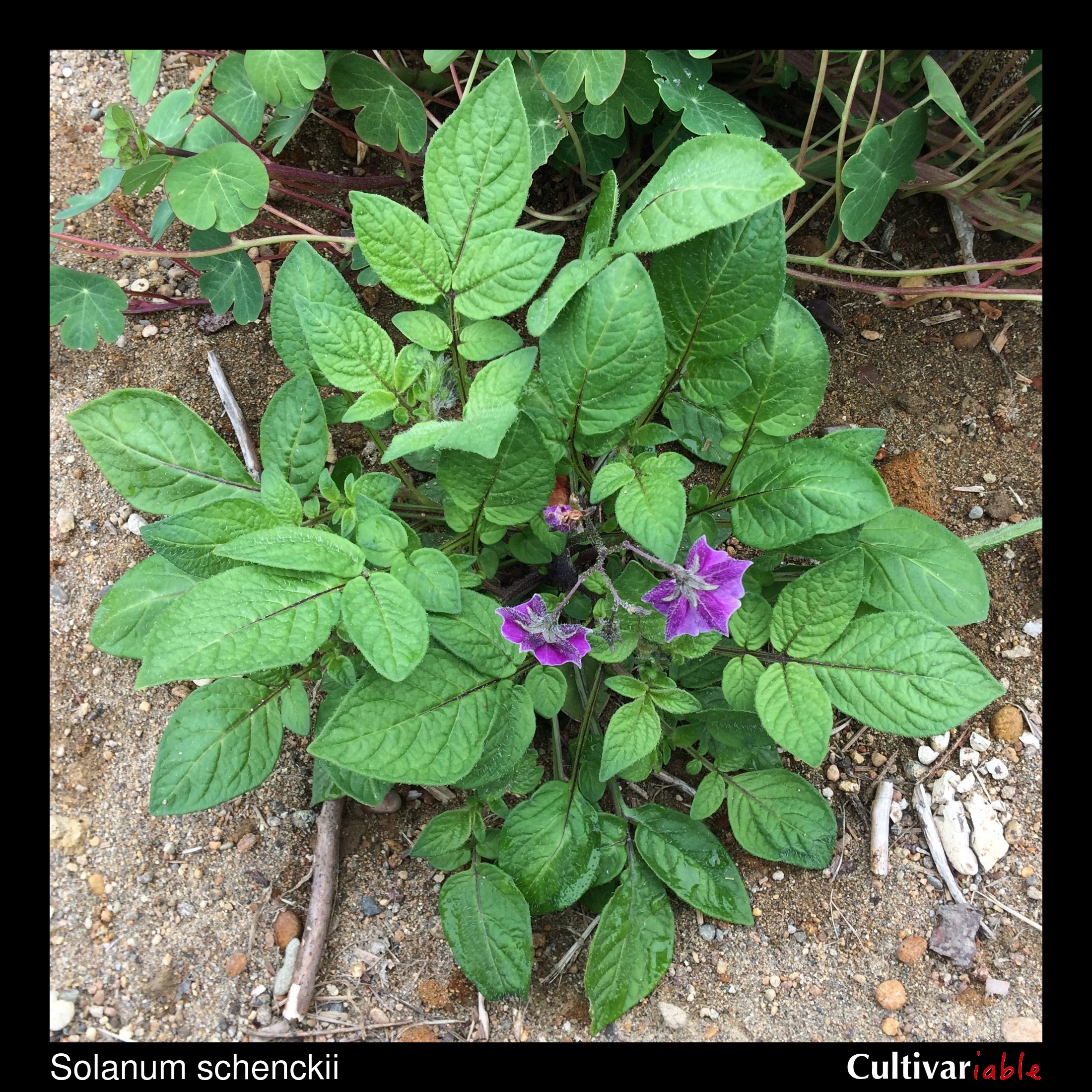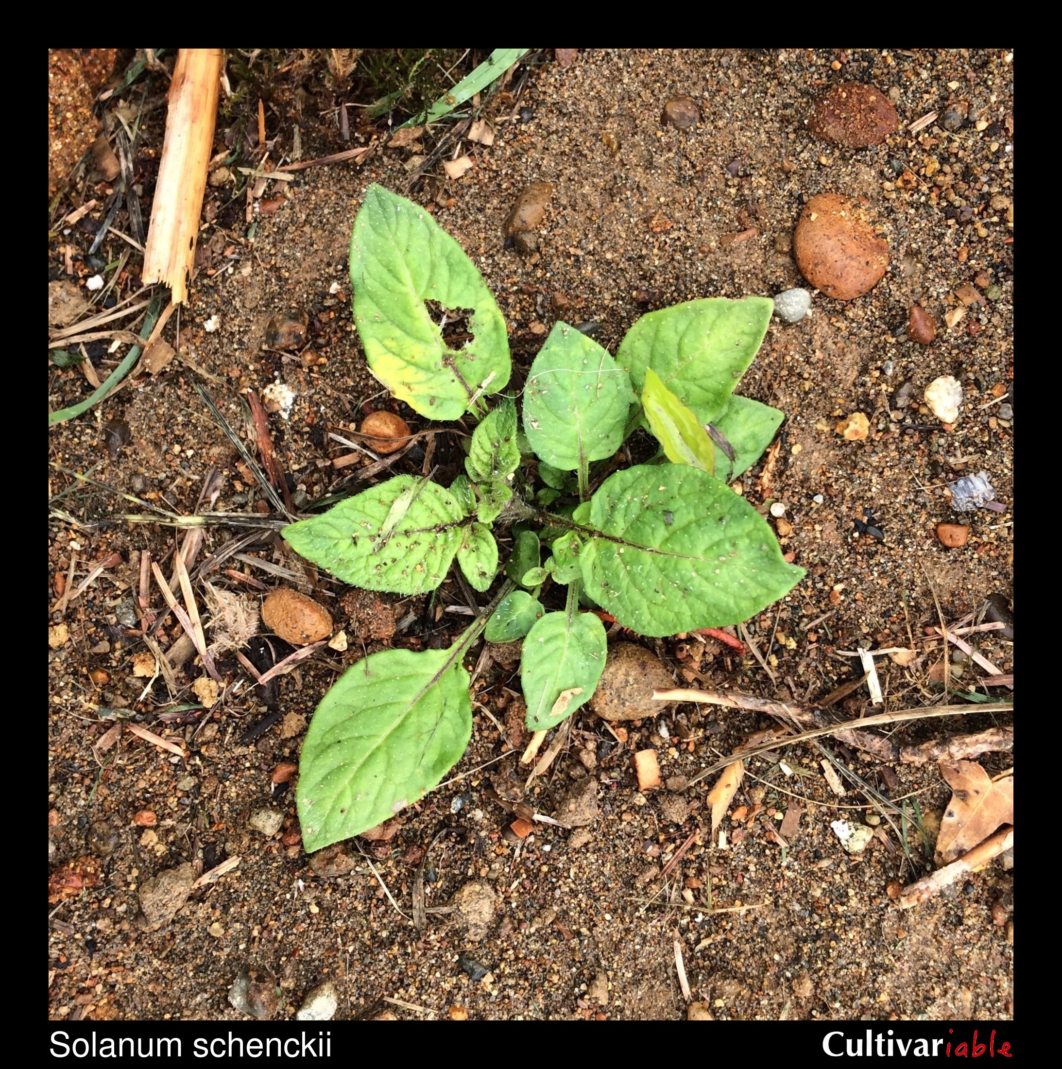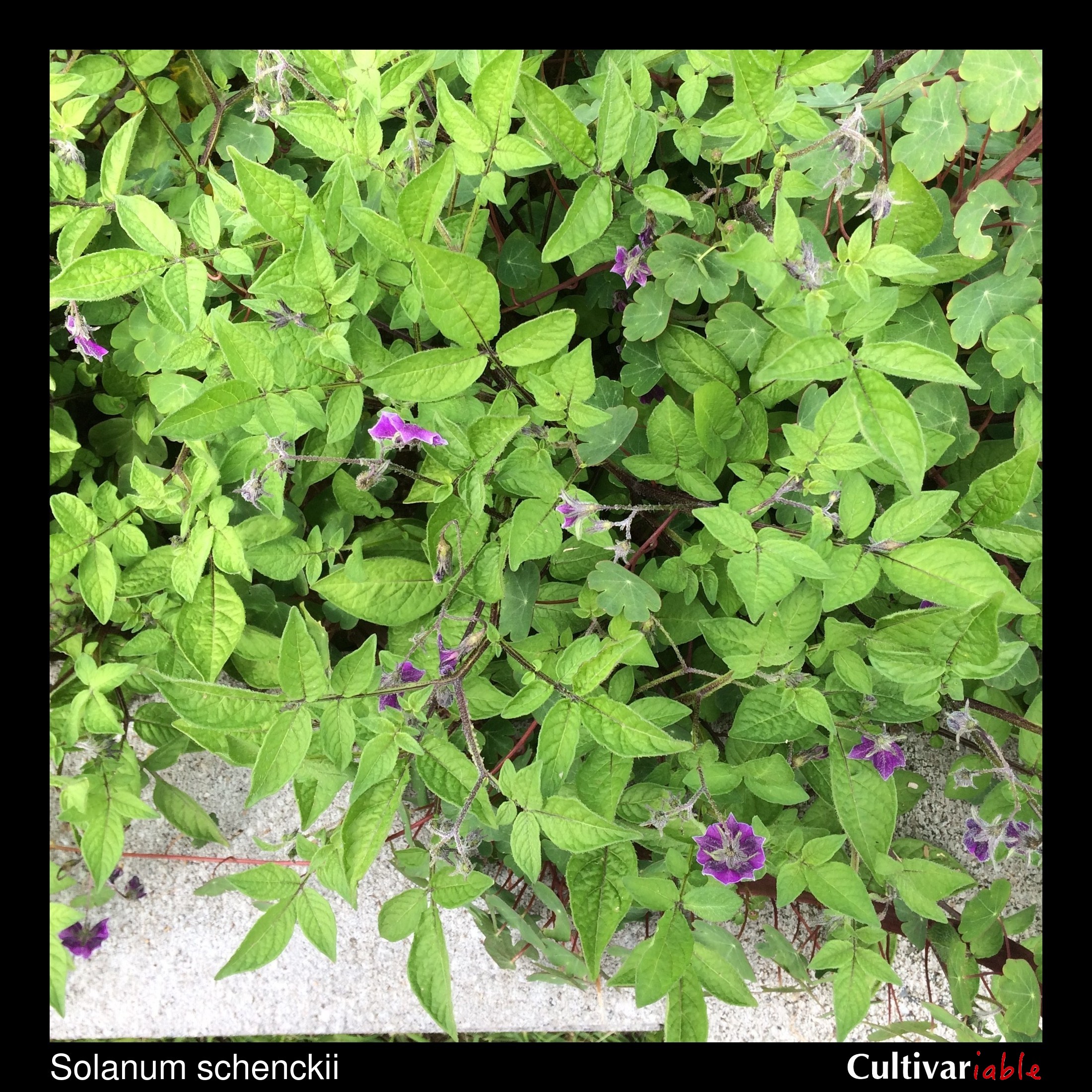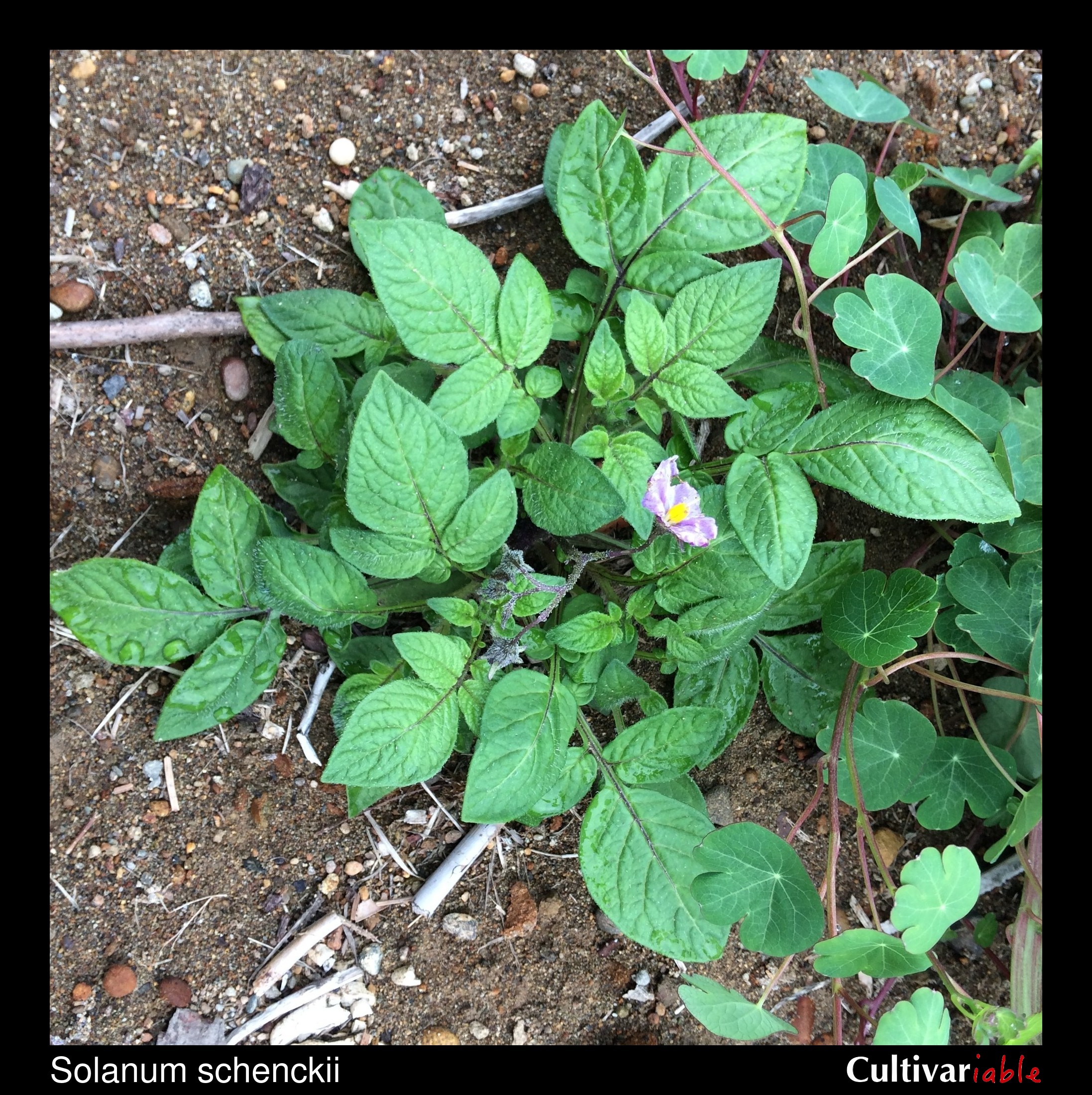 Solanum schenckii is a woodland species from central Mexico. Plants roughly 12 to 18 inches tall. Flowers violet to purple. Berries long and ovoid, green with white or lighter green spots.