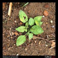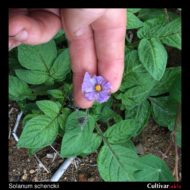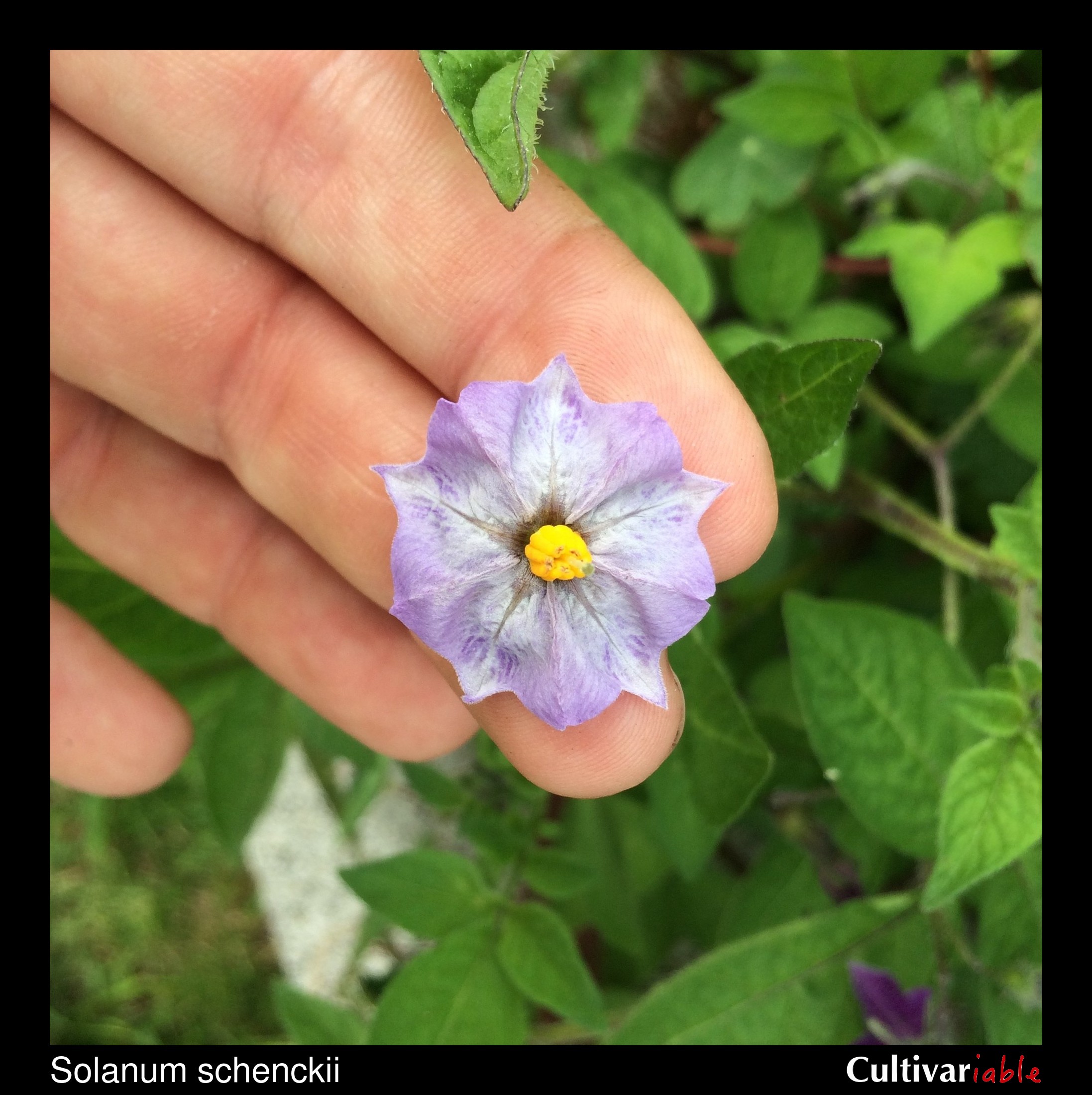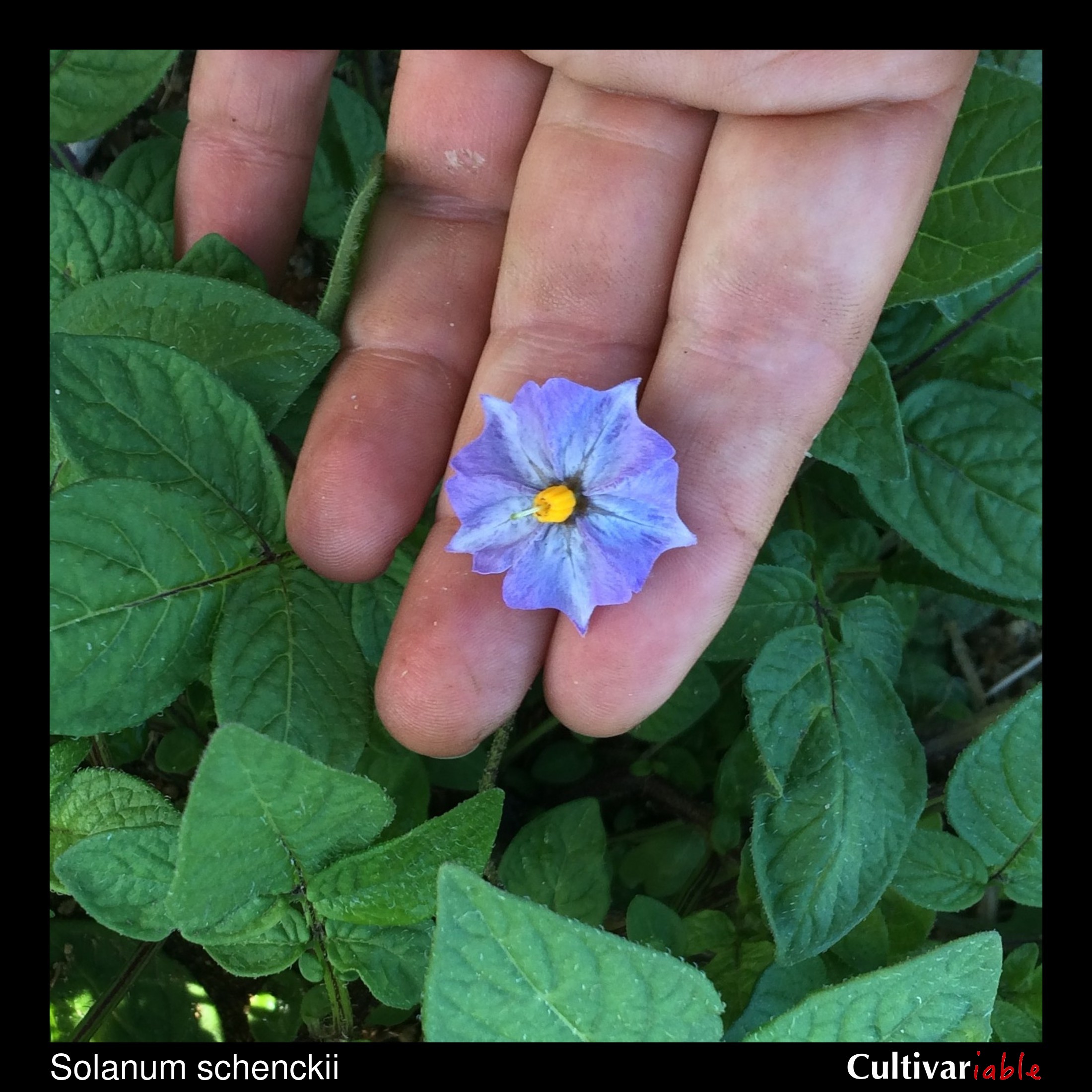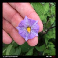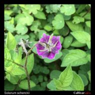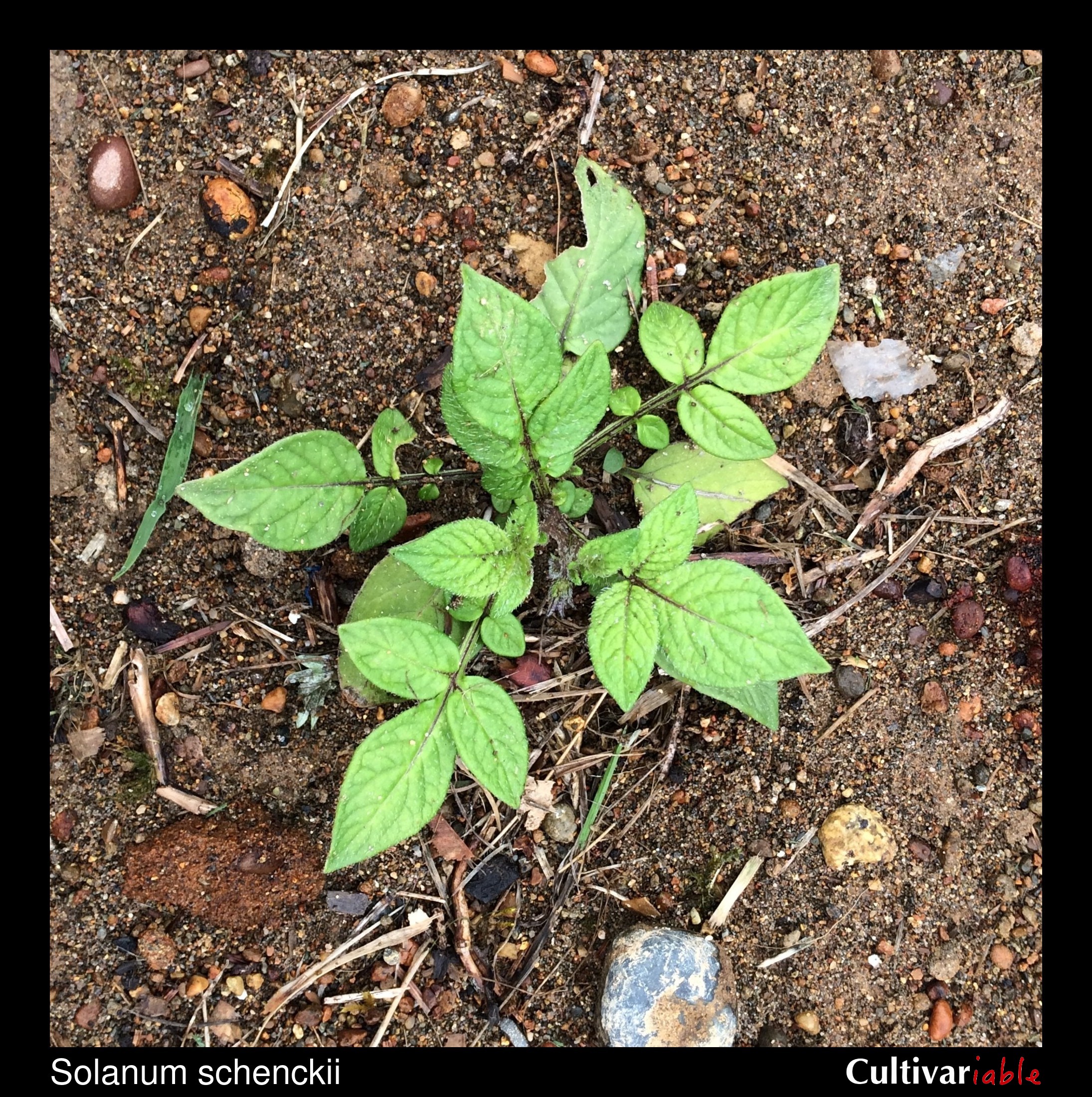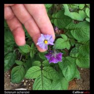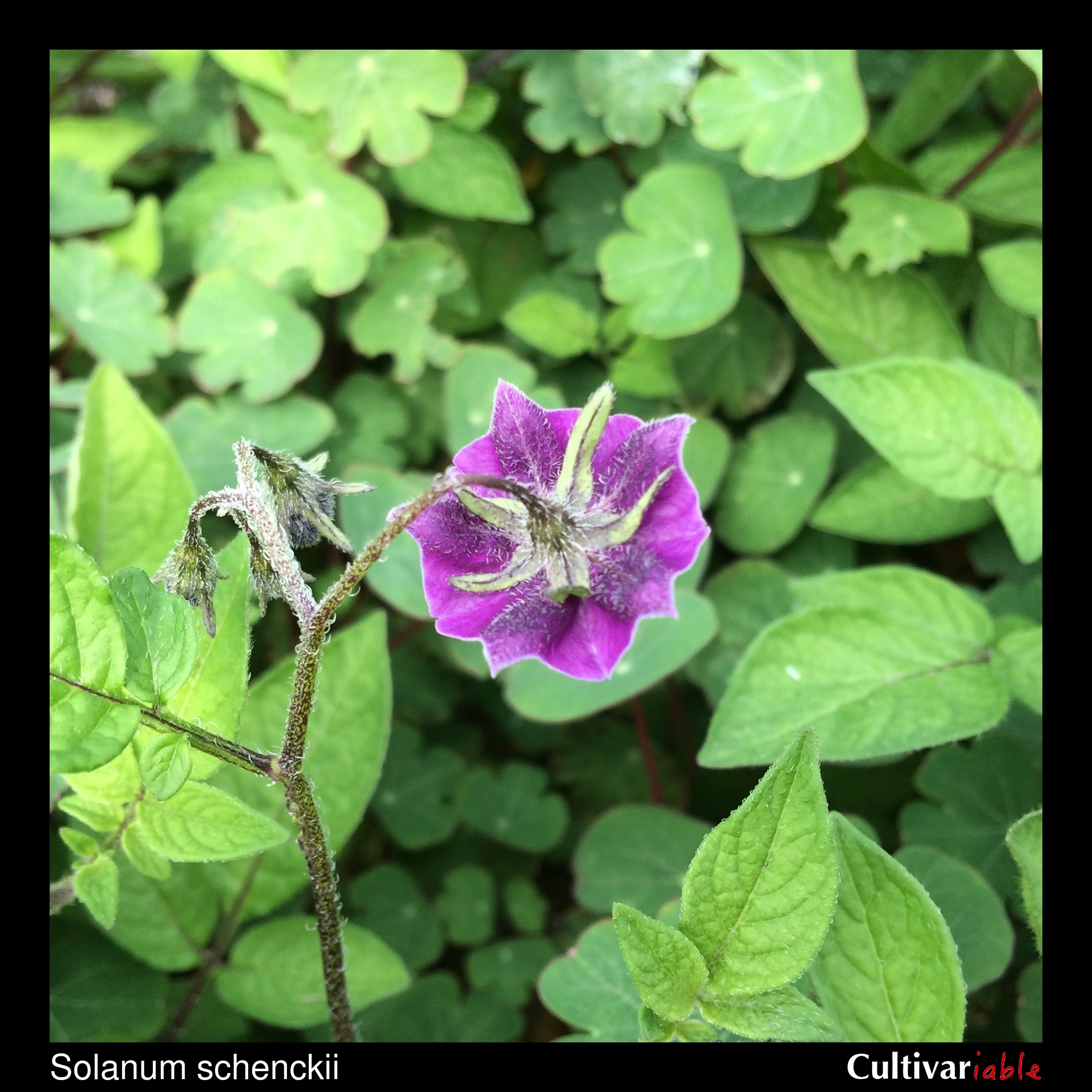 Solanum schenckii is a woodland species from central Mexico. Plants roughly 12 to 18 inches tall. Flowers violet to purple. Berries long and ovoid, green with white or lighter green spots.