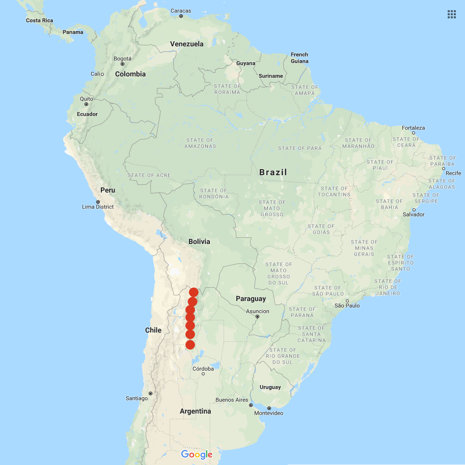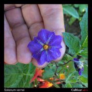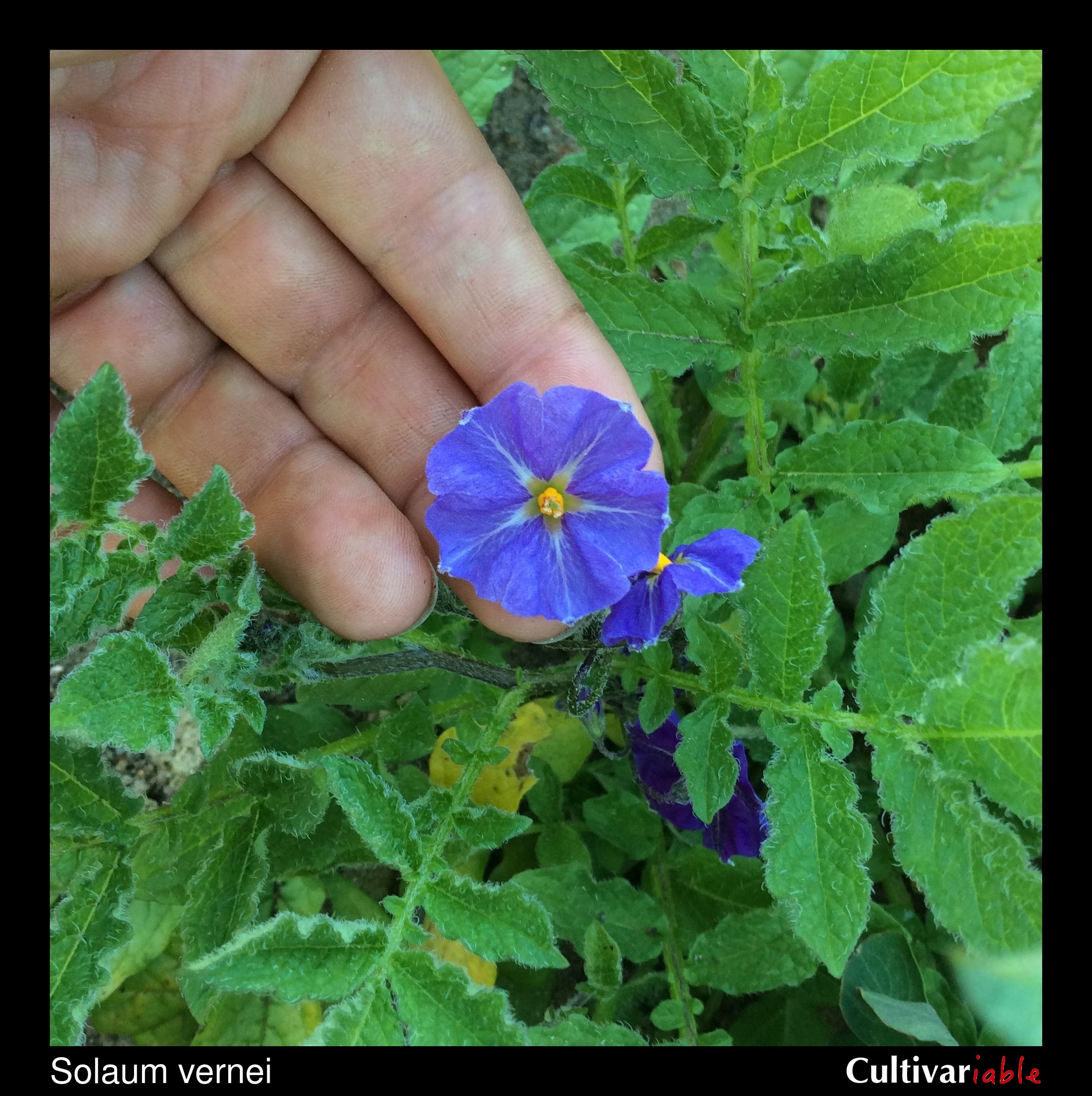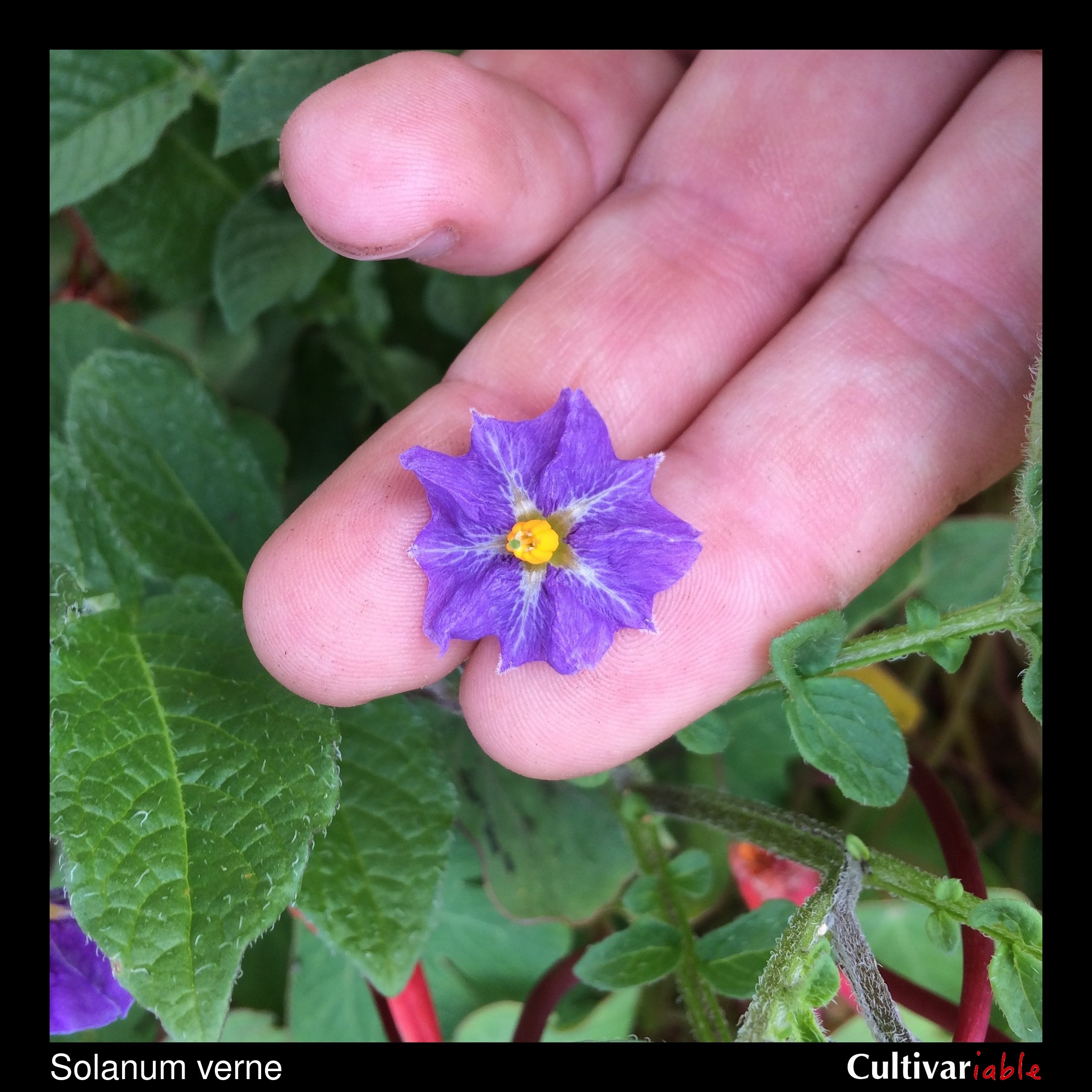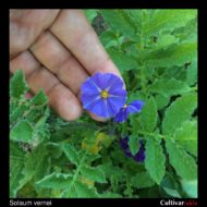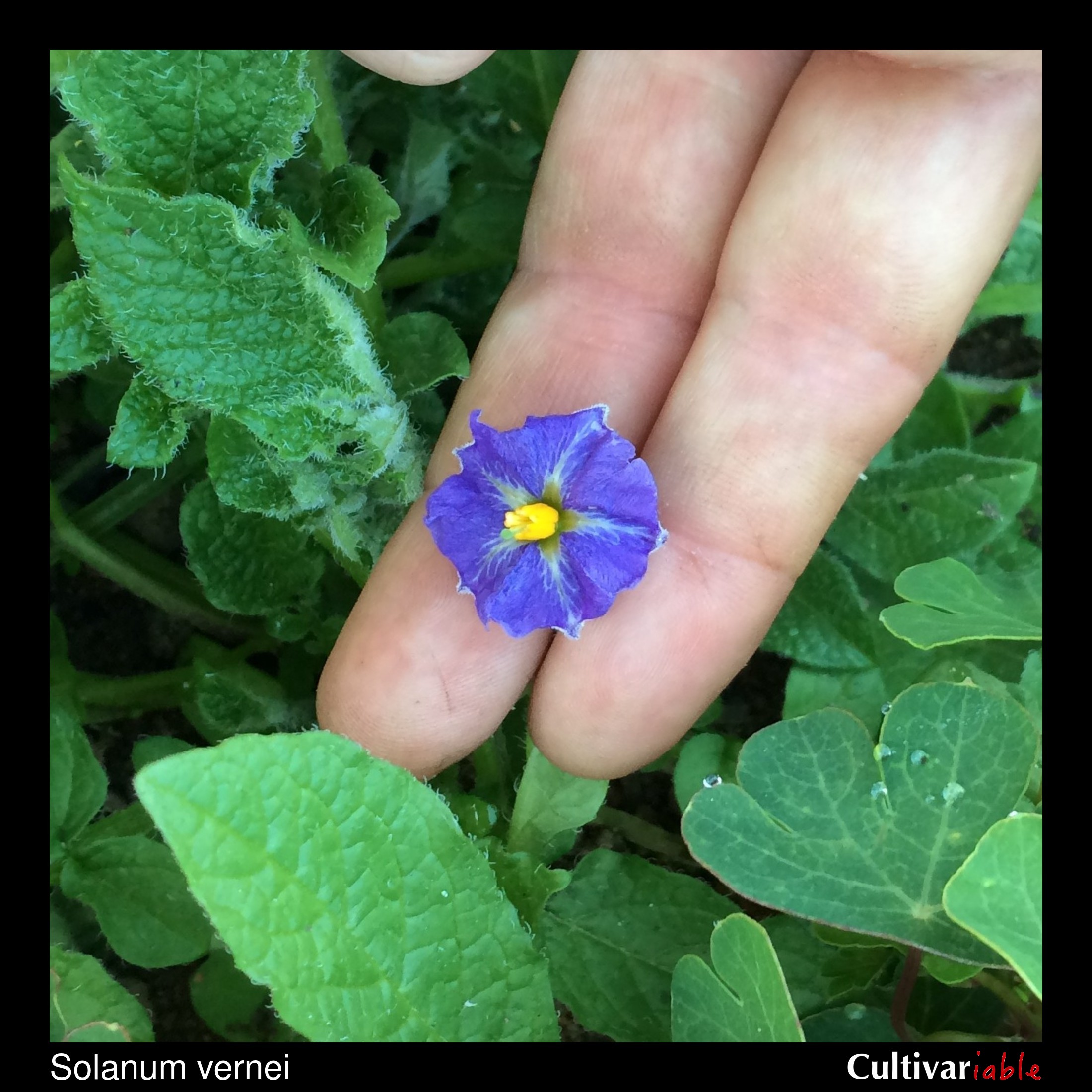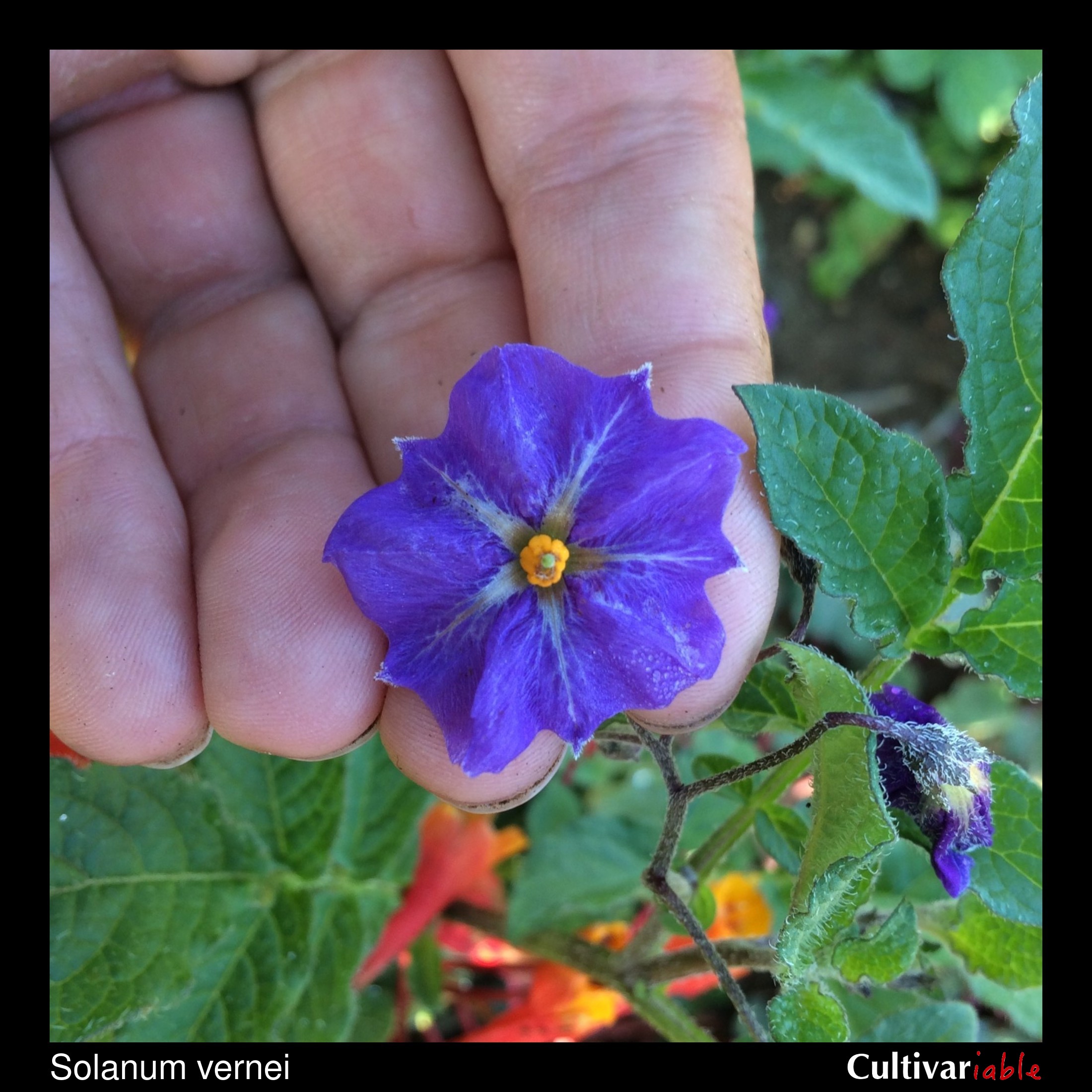 Solanum vernei is a wild potato species native to Argentina and just barely reaching into Bolivia.  Plants can reach a bit more than four feet tall.  Purple flowers.  Berries are small and light green.  Stolons more than two feet long.  Tubers are small, whitish, round to ovoid.  This species can survive frosts down to 23 degrees F (-5 C) (Li 1977).  Vega (1995) found that this species is more frost tolerant than domesticated potato.