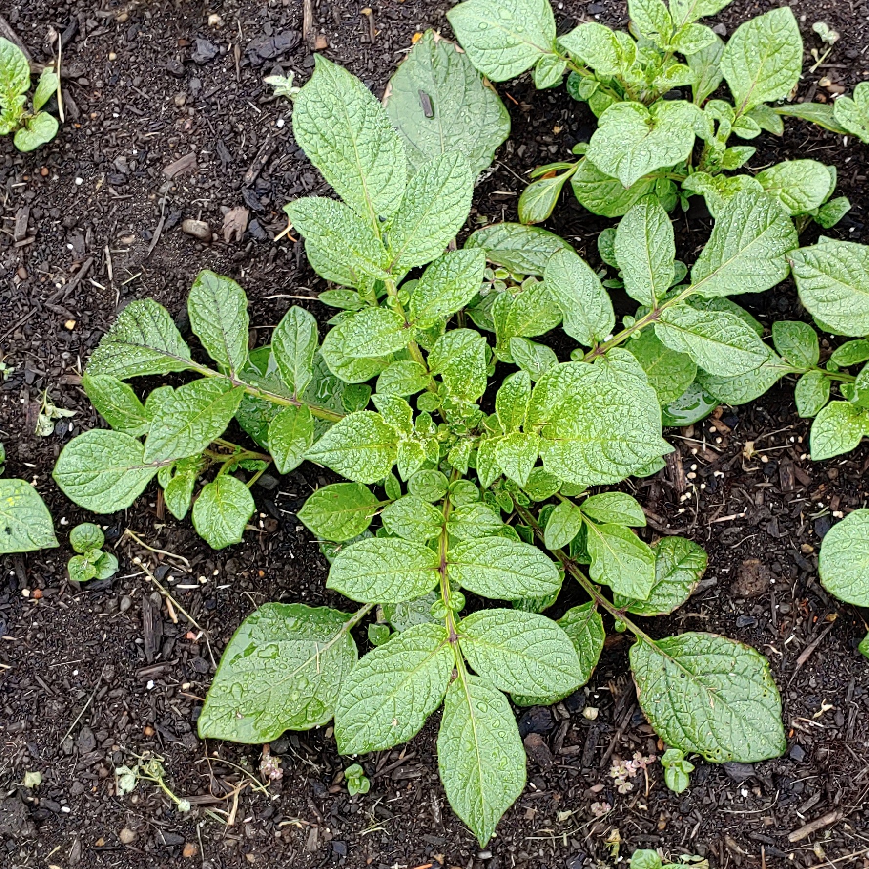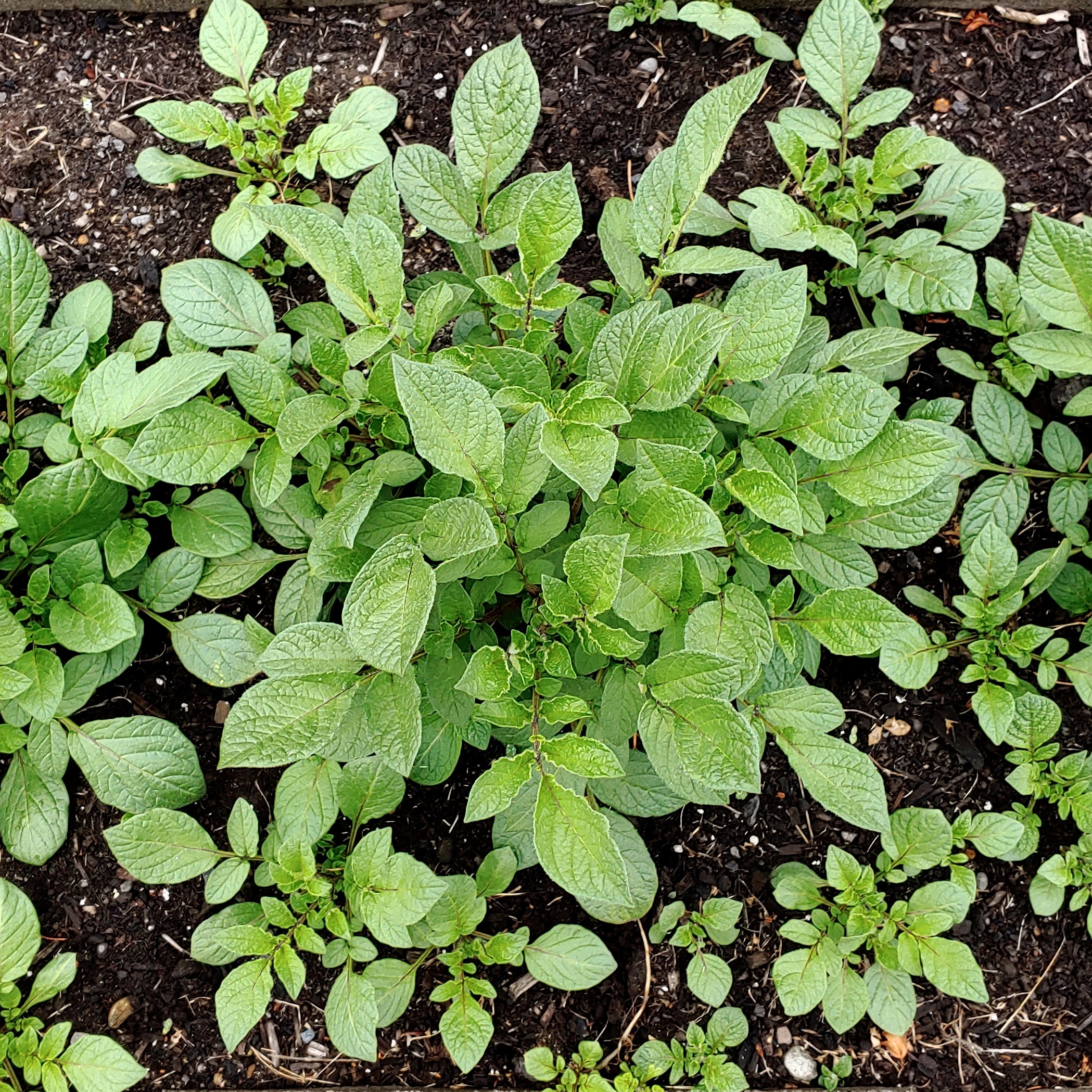 Solanum x edinense is a natural hybrid species from central Mexico, generally found in areas of potato cultivation. It is thought to be a cross of domesticated S. tuberosum x S. demissum. Plants range from three to six feet tall, more similar in form to domesticated potatoes than S. demissum. Flowers are typically blue, less commonly white. Berries are round, similar to the domesticated potato, but often seedless. Some clones appear to be male sterile, while others set small amounts of seed when self-pollinated. Tubers are small, usually less than an inch, and blue or white. The stolons are very long, reaching five feet or more in some accessions.