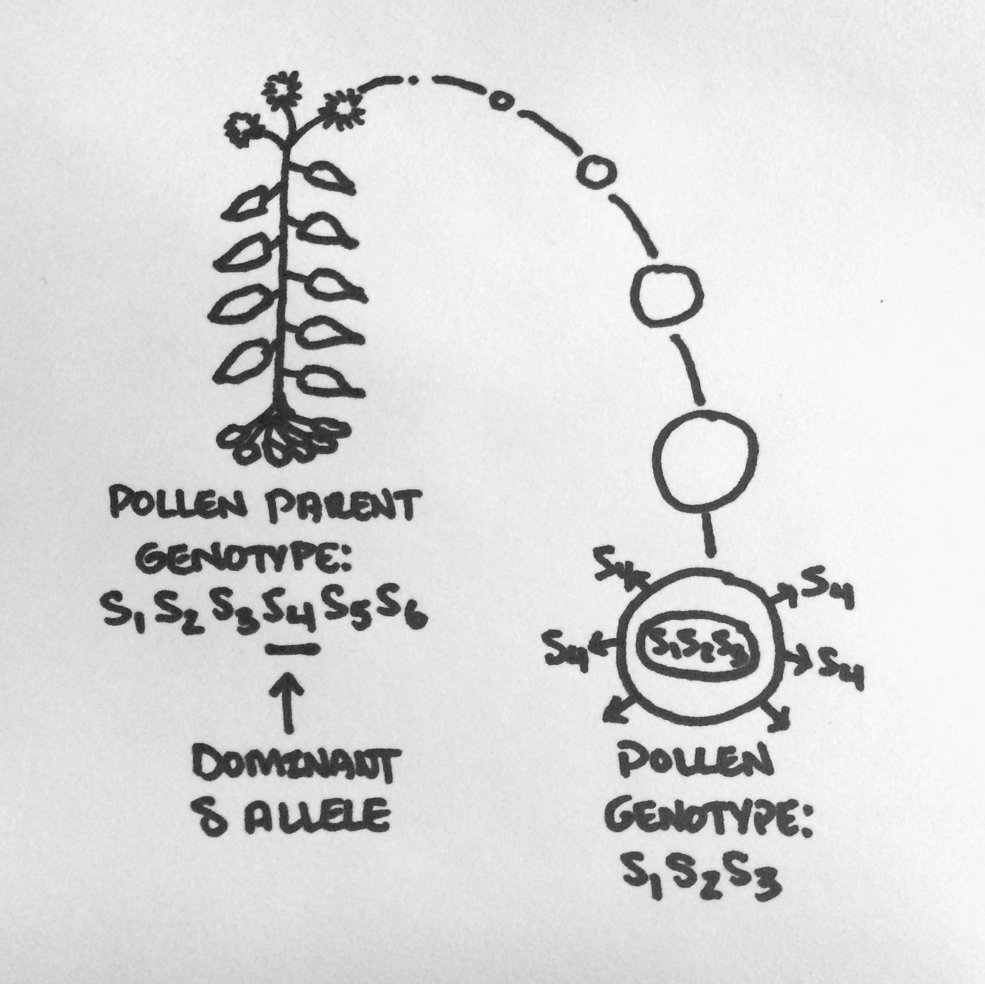 If you had a hard time understanding that, join the club. It took me several revisions of this post to realize that I didn’t know what I was talking about. Hopefully I do now. GSI and SSI appear very similar, but SSI is actually much more complicated. In SSI, the S locus controls the creation of elements in the pollen coat that interact with the receiving stigma to determine compatibility. The S alleles can be dominant, co-dominant, or recessive, which allows for significant variations in compatibility. For example, if one of the alleles is dominant, it is the only one that matters in determining compatibility.