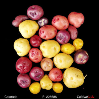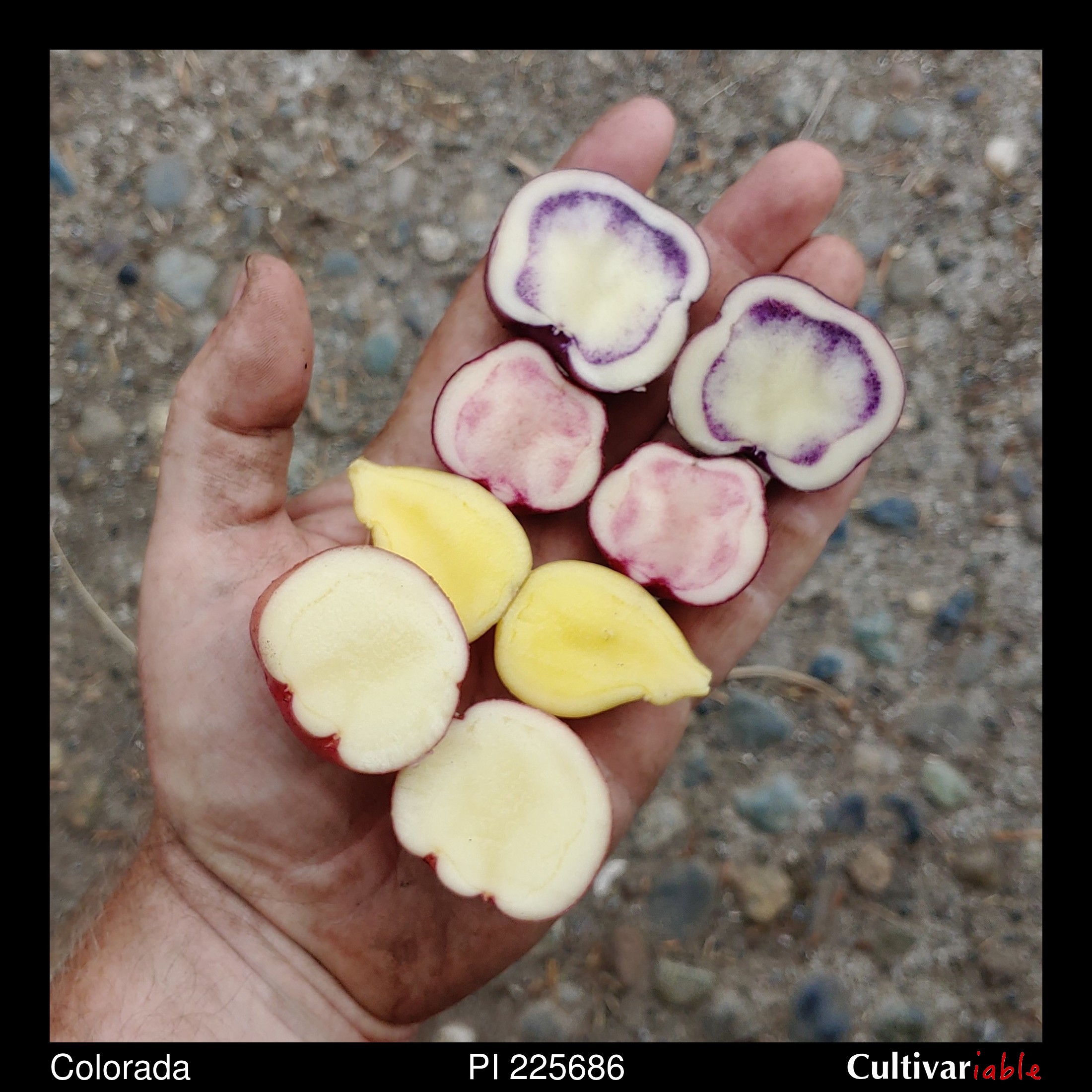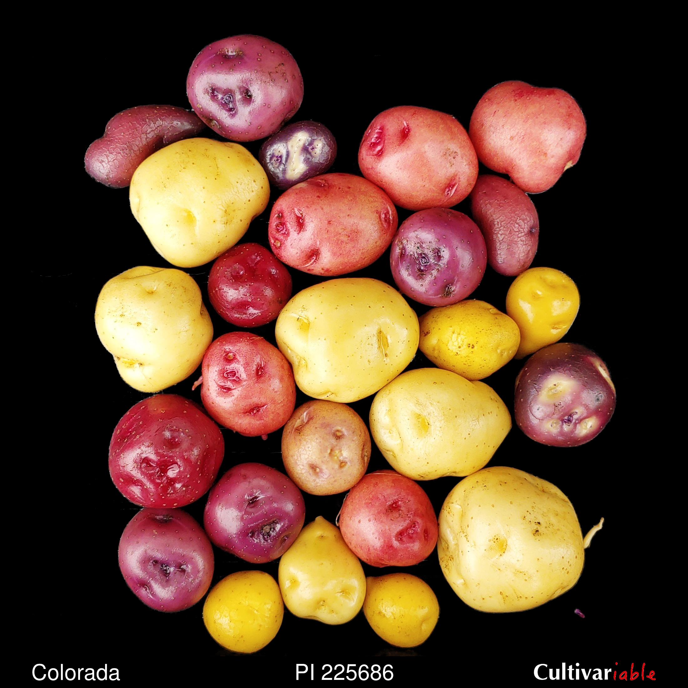 TPS. Good germinator. Round to compressed. Reds, blues, and yellows. Many with colored flesh. Mid to late season. Short stolons. Low to fair berrying.
