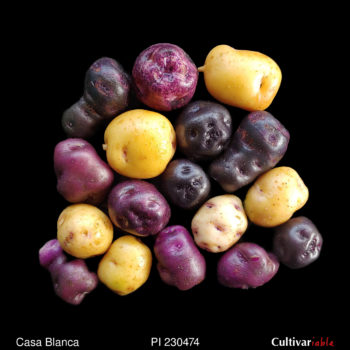 TPS. Round to elliptic. Mostly blues, some yellows and whites. Mostly white to light yellow flesh. Some with moderately deep eyes. Late and mostly short day. Short to mid stolons.