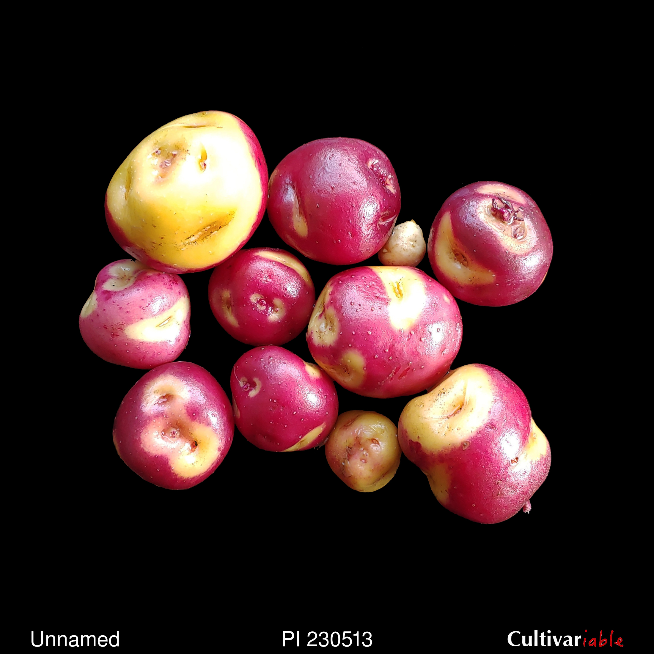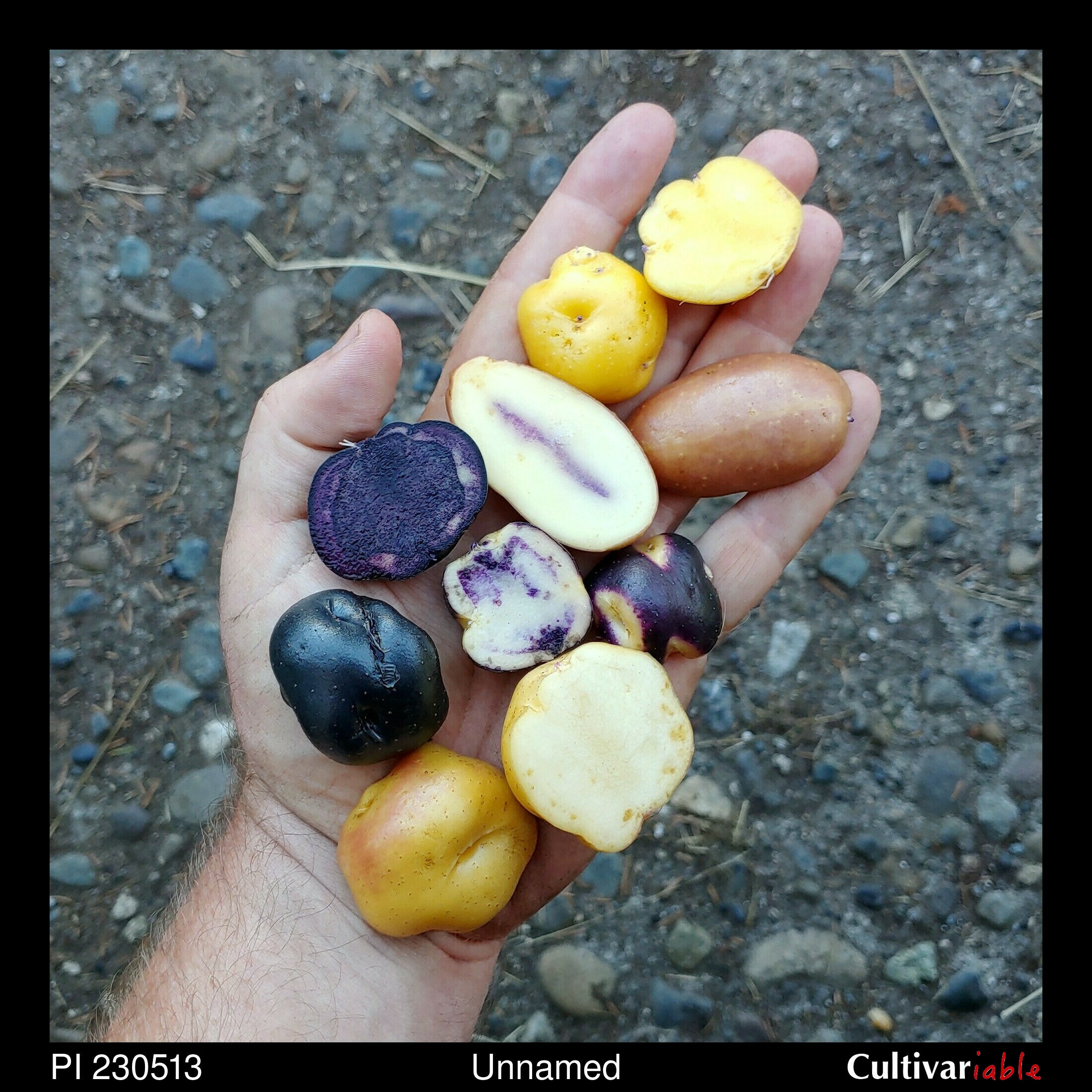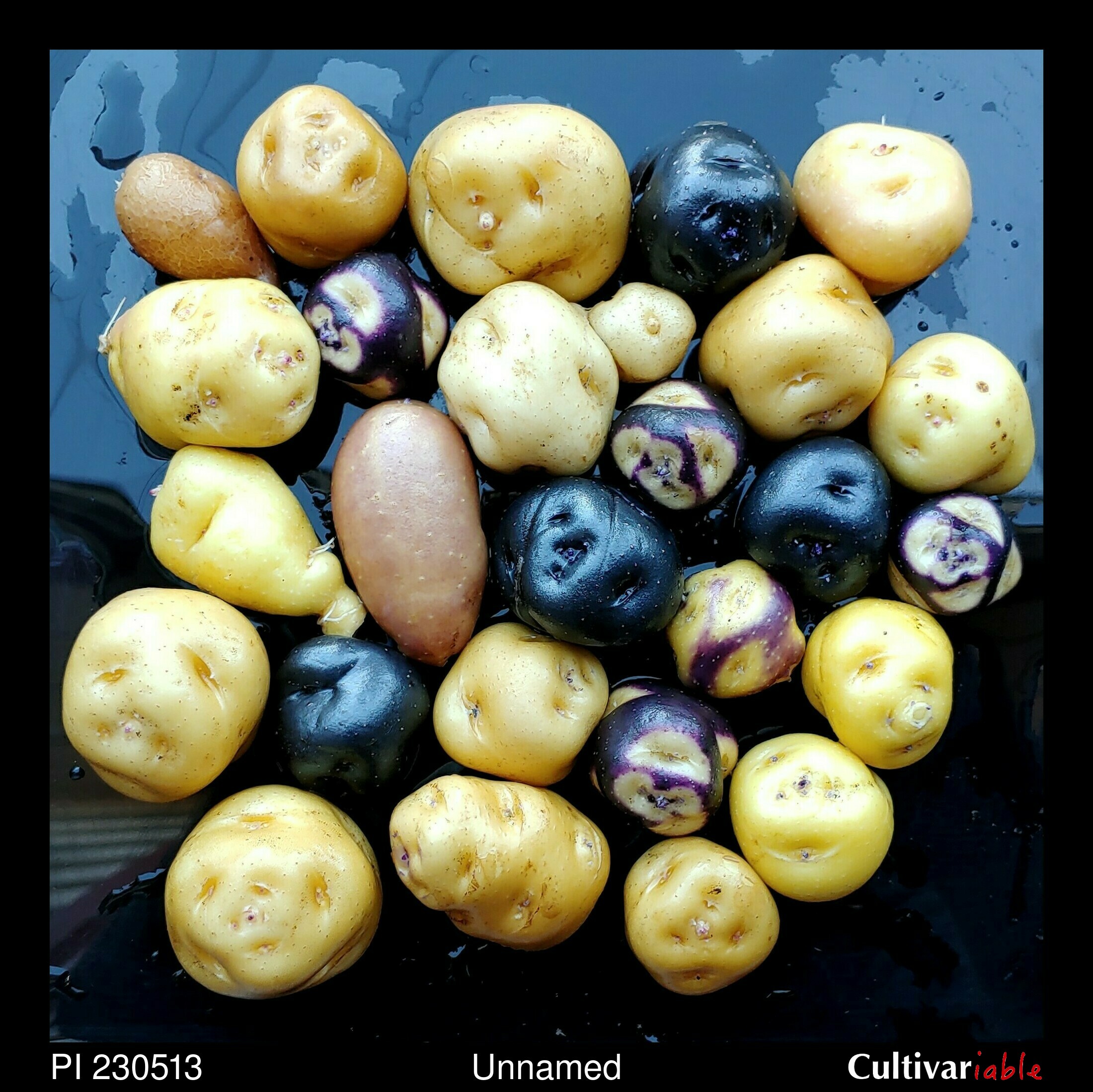 TPS. Poor germination and poor survivial on first trial. Better results in second attempt, although the seedlings still had poor vigor. Tubers mostly compressed to round, a few obovate. Mostly yellows and whites, some blues and reds, some with contrasting eyes. Mostly yellow flesh, some with good intensity, also some blue flesh. Late season. Mostly short day. Short to mid stolons.