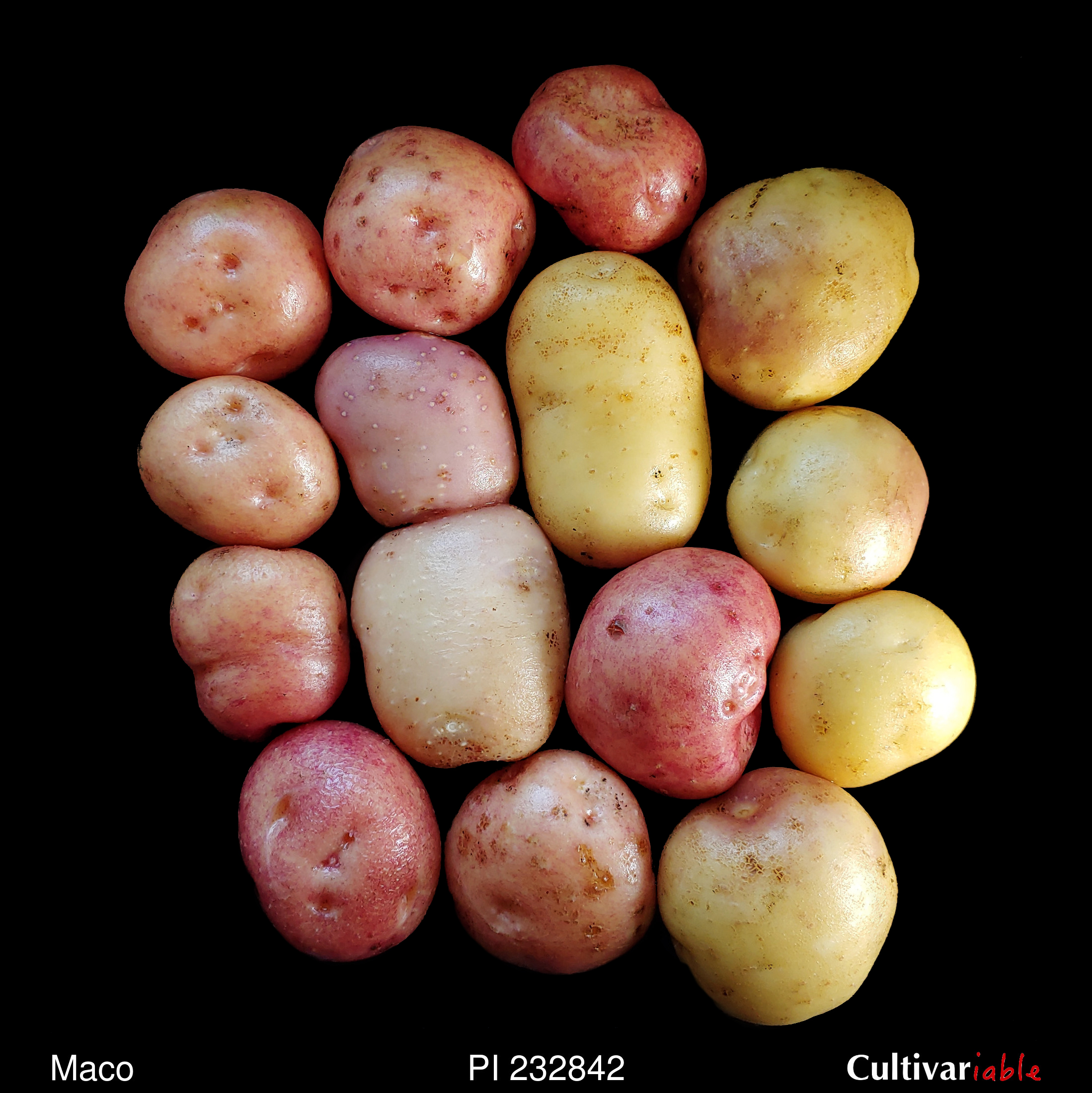 TPS. Compressed, round, elliptic. Pinks, yellows, and whites. White flesh. All long day. Short stolons. High yield and high tuber count.