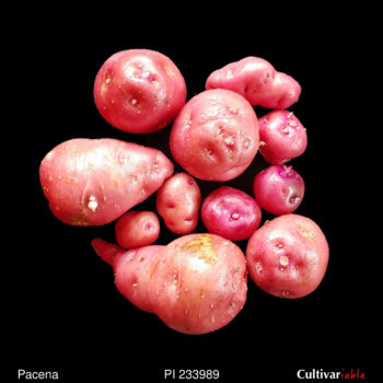 TPS. Normal germinator, 7+ days. Low germination. Round to obovate. Reds with white flesh. Intermediate to long stolons. Good long day performance.