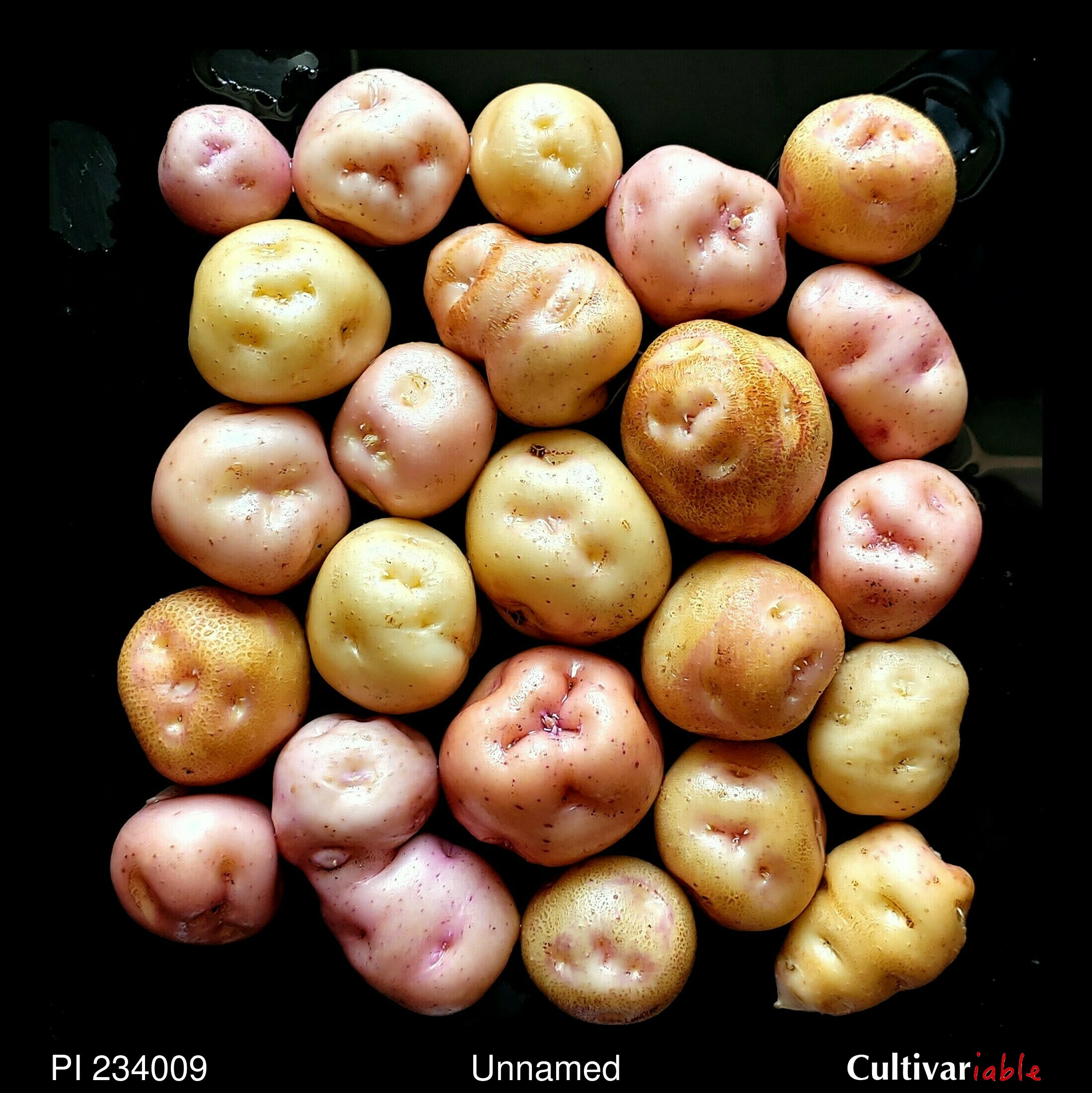 TPS. Moderate germination. Tubers mostly round to compressed, a few ovate. Moderately deep eyes. Yellows, whites, and pinks with white flesh. Many with high yield and high tuber count. All long day. Stolons short to long, but most in between. White flowers. Low to moderate flowering and seed set. Tubers not bitter, floury texture and pleasant flavor.