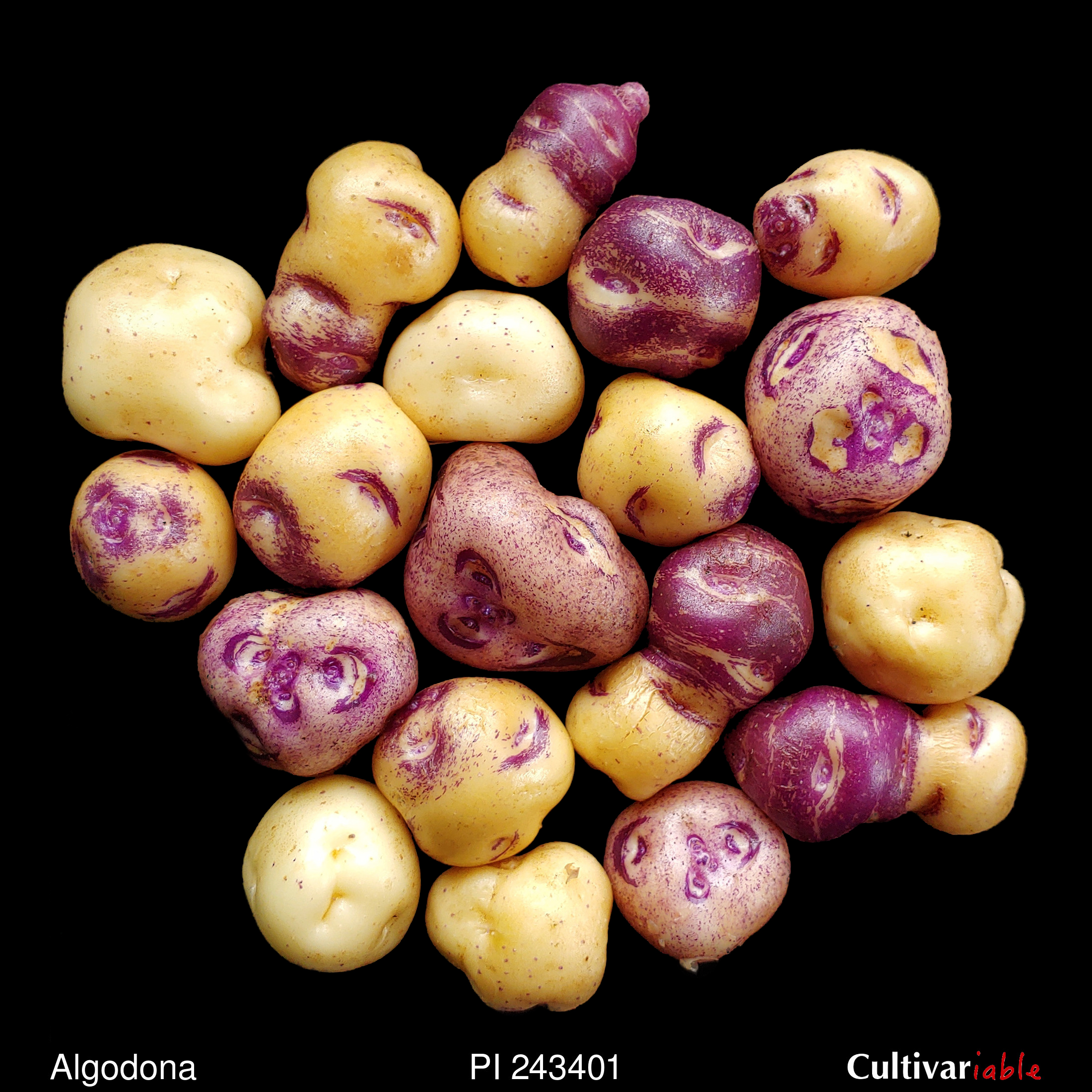 TPS. Normal germinator, 7+ days. High germination. Intermediate survival to transplant. Compressed, oblong. Whites and light yellows with blue. White to light yellow flesh. Short stolons. Late season, some short day.