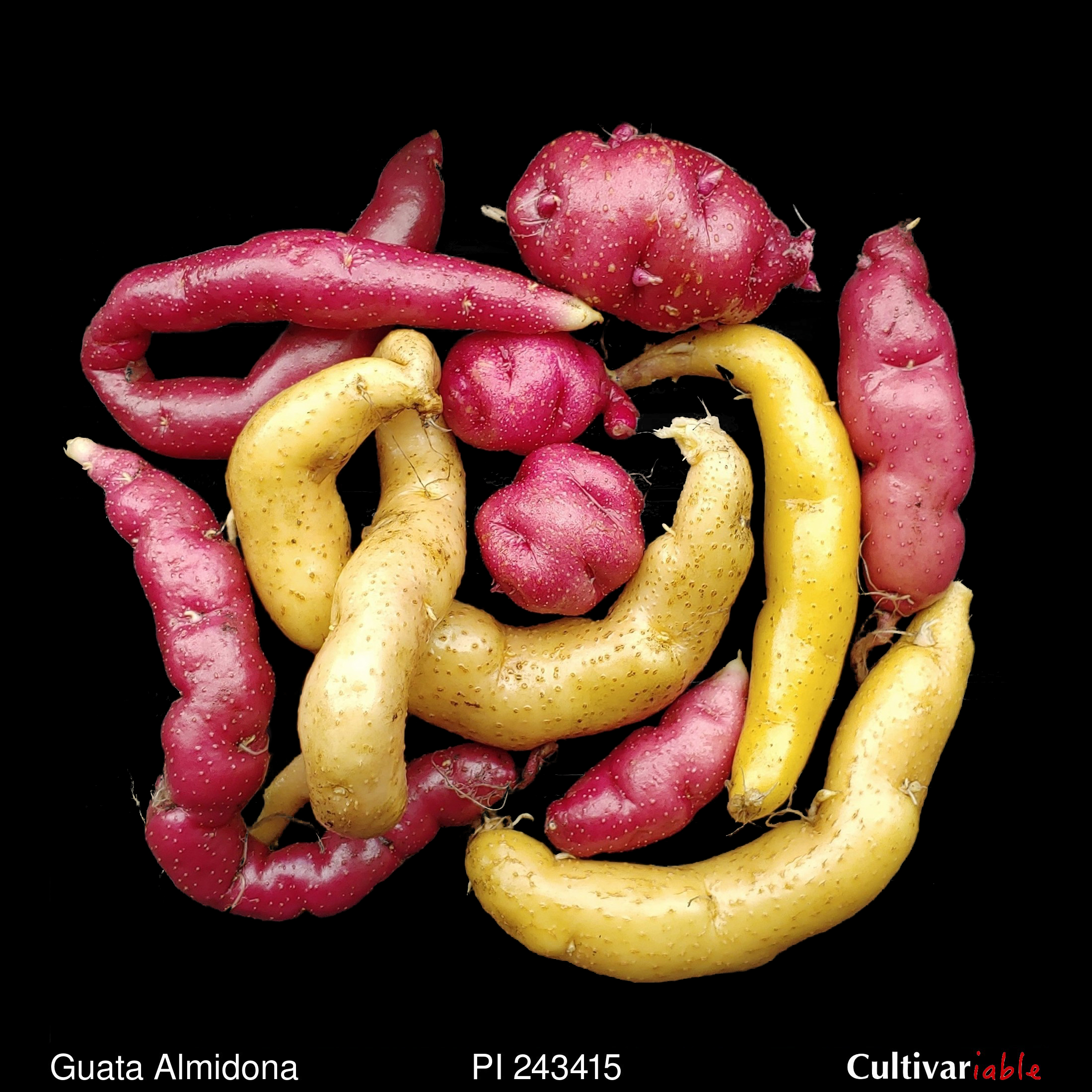 TPS. Mostly elongate with a few round to ovate. Some very long and serpentine. Reds and yellows, some with vascular ring color. Shallow to moderately deep eyes. Mid to late season. Short stolons. Abundant berries and excellent seed set.