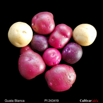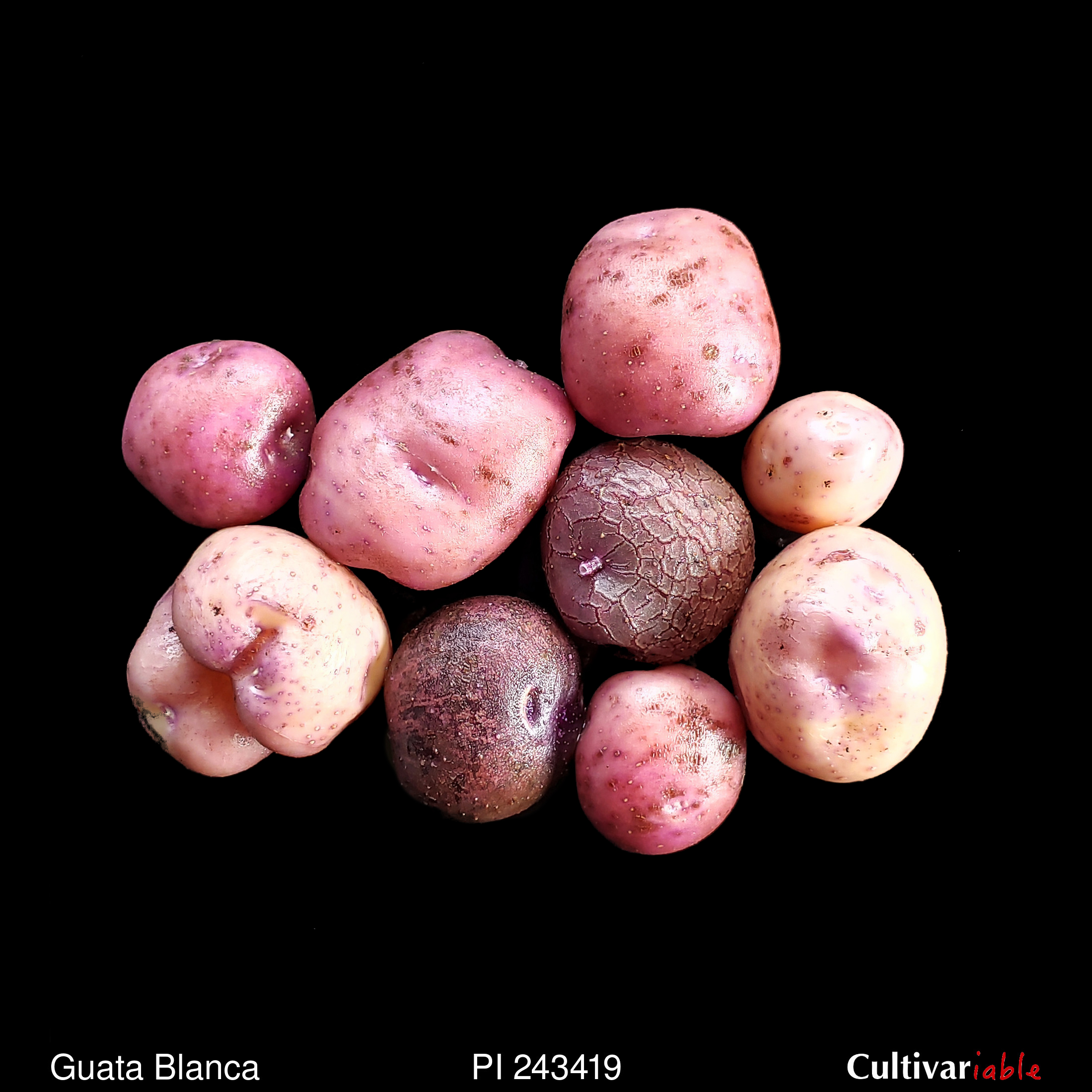 TPS. Round, obovate, oblong. Reds, blues, and whites. Mostly white flesh, some with a light blue or red ring. Short to mid stolons. Late season, some short day.