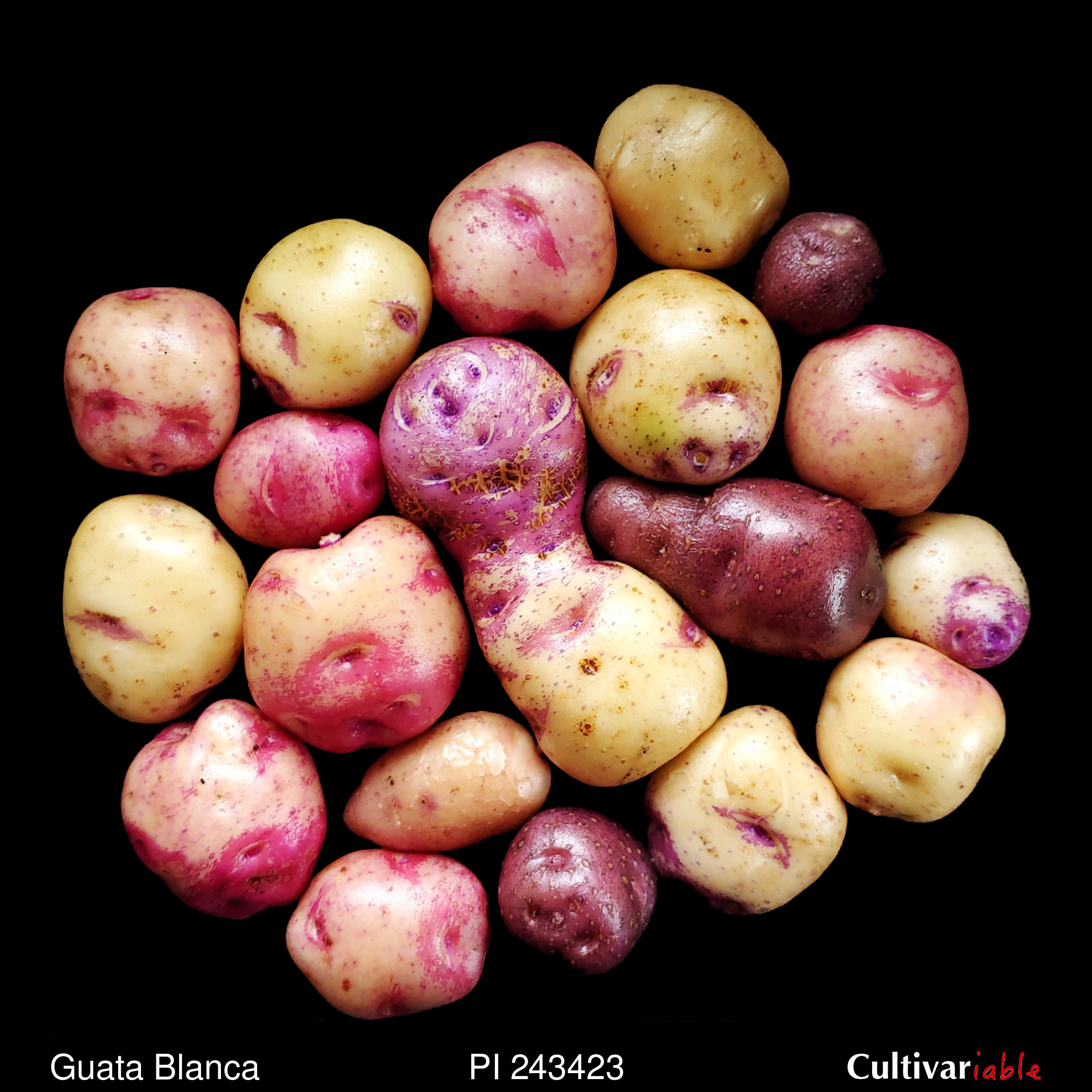 TPS. Round, oblong, elongate. Whites, many with red, some with blue. A few blues. Flesh white to light yellow. Stolons short to mid. Late season but mostly long day.