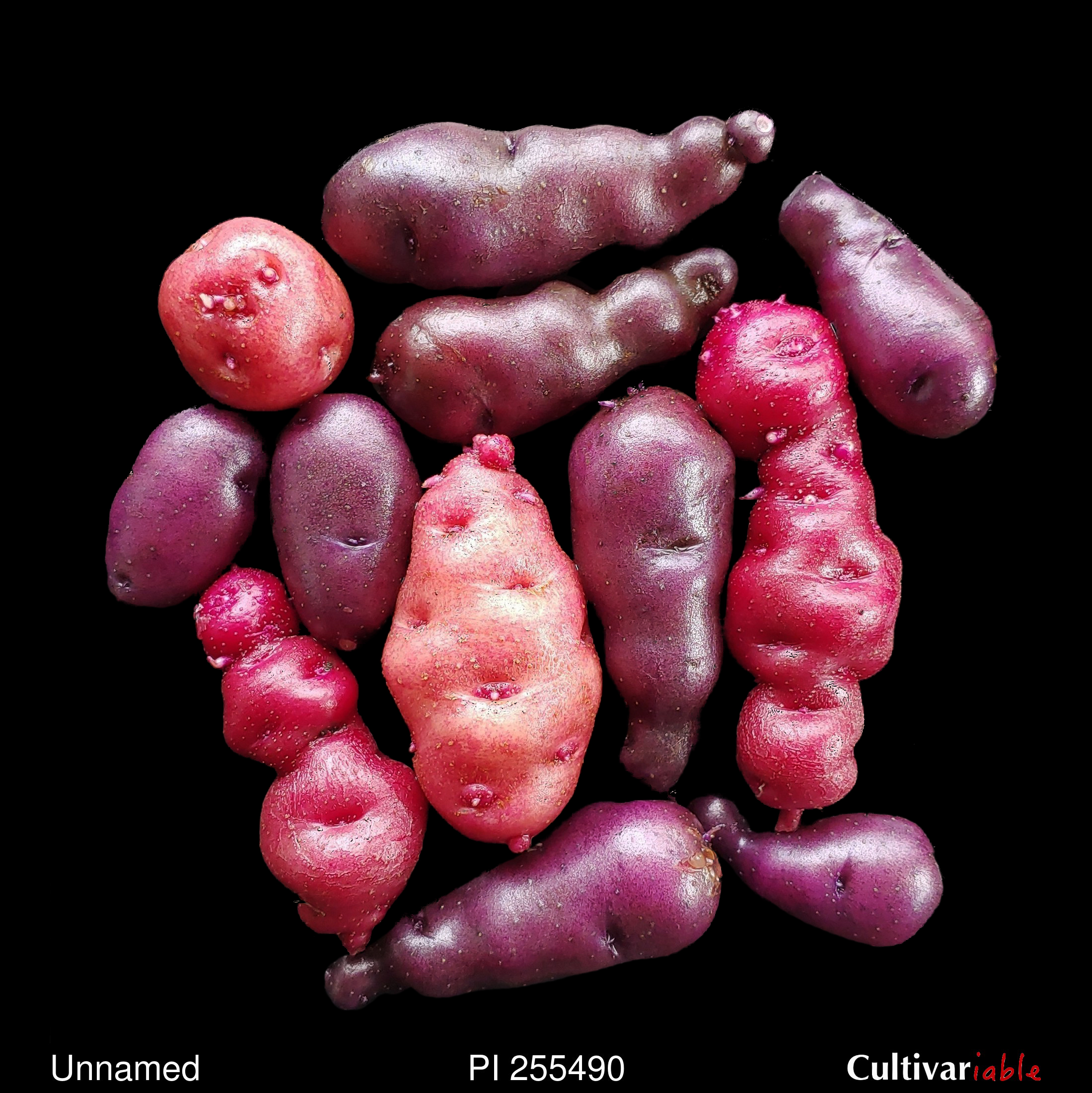 TPS. Tubers mostly ovoid, some round. Medium to shallow eyes. Mostly blues, some reds, some white with red. Mostly white flesh, some with a touch of color. Abundant flowering. Plenty of berries with high seed counts. Short to medium stolons. Foliage affected by early blight. Late season and some short day. Long dormancy.