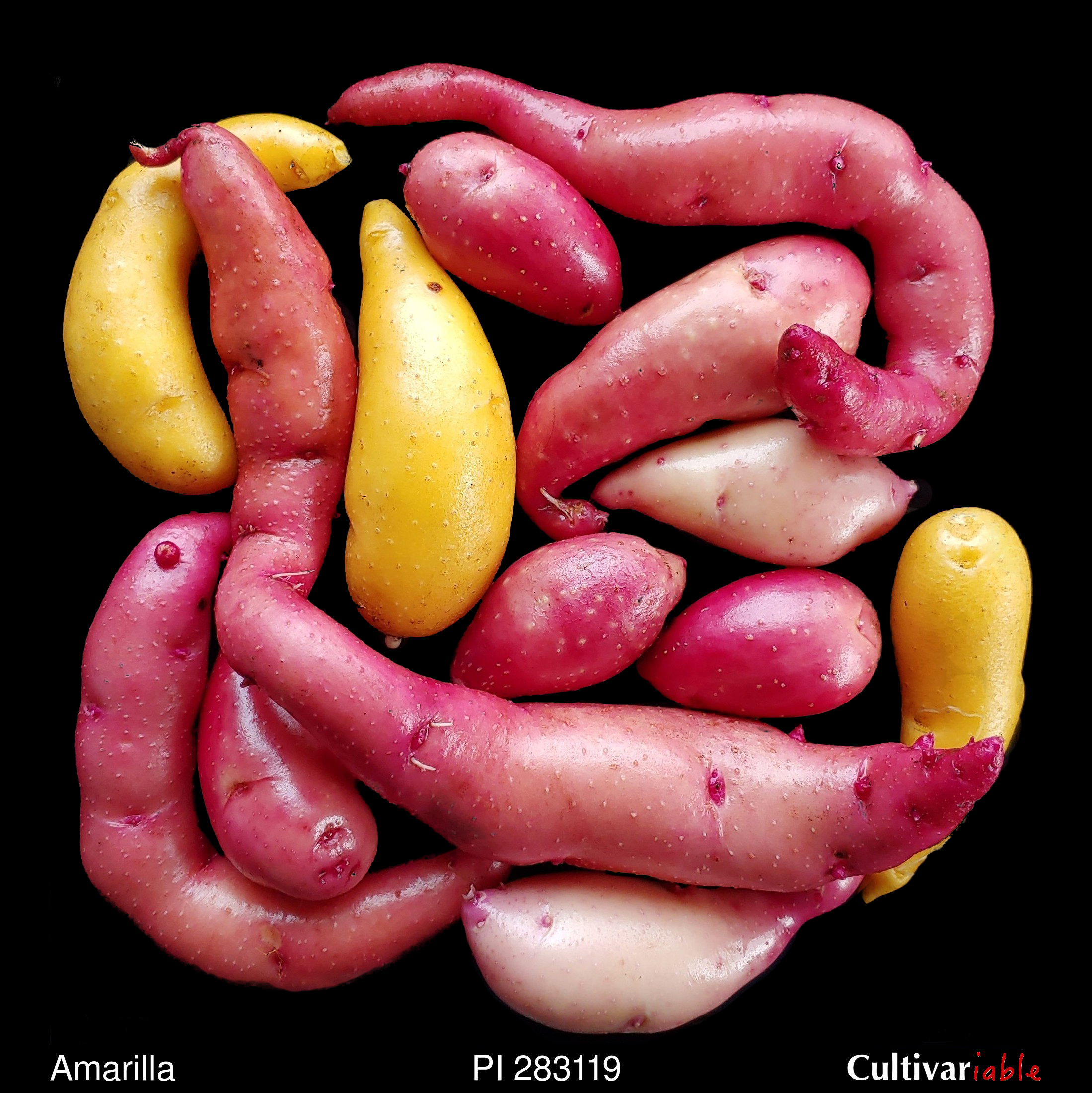 TPS. Elliptic, reniform, elongate, serpentine. Reds and yellows. White or yellow flesh. Mid to late season. Long day. Short stolons.