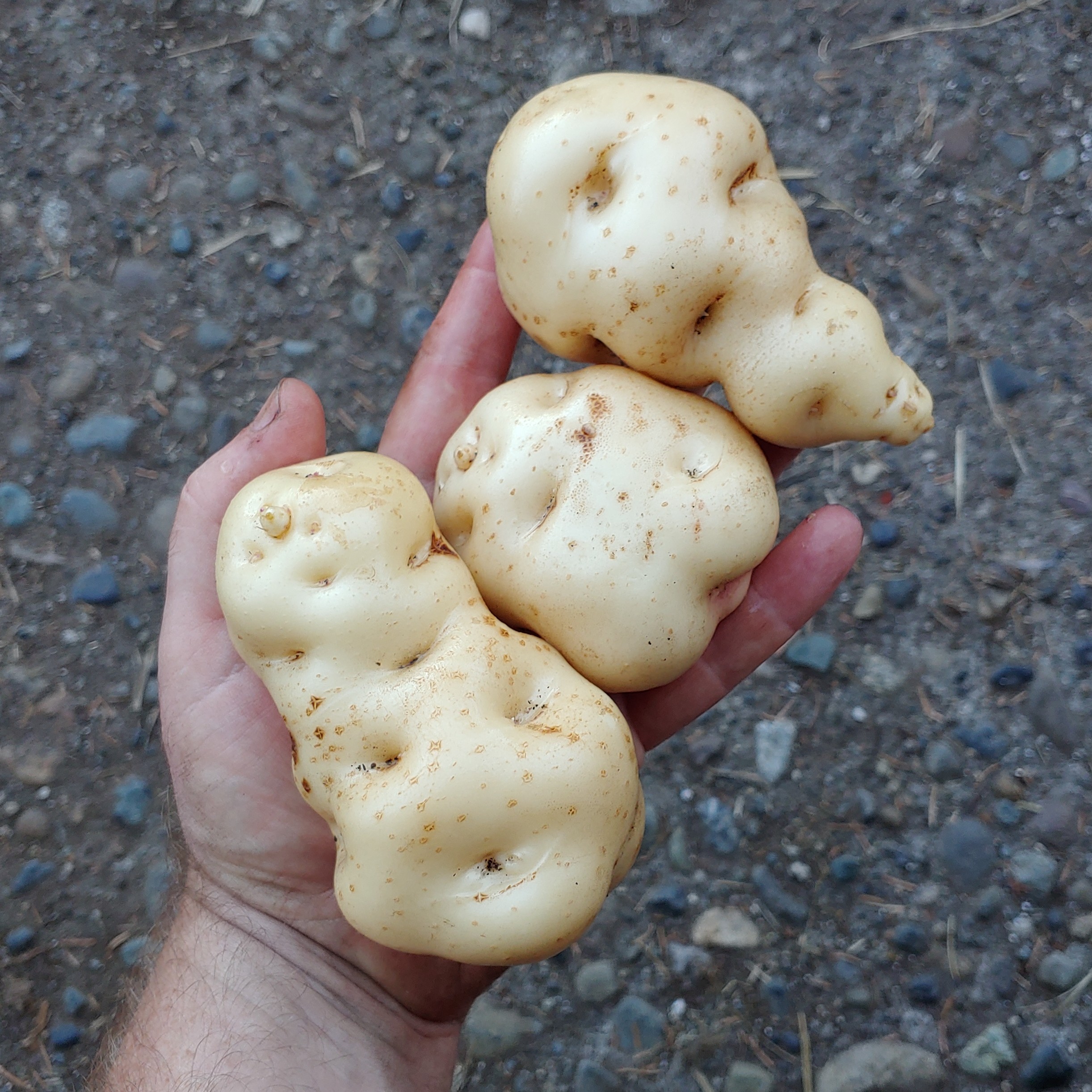 Clone.  Round to oblong, white skin and flesh, sometimes with a slight red blush at the proximal end.  Tubers have varied significantly in size over three growing seasons, but they are capable of producing large 4-5 inch tubers and yields in excess of two pounds during long days.  Late maturity.  Large plants.  Floriferous.  Abundant pollen.  Short stolons.  Intermediate dormancy.  Fairly vulnerable to scab under dry conditions.  Floury texture, moderately thick skin.