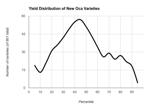Out of 601 varieties, 5 reached the 95th percentile of heirloom yield (two of those significantly exceeding it). That’s 0.83%. That may not sound encouraging, but it really isn’t bad at all. 1 out of 120 seedlings performed as well as the best heirlooms. The 60th percentile was 433 grams, which, for the metrically challenged, is close to a pound. So, about 1 in 3 seedlings yielded 1 pound or more per plant. If you also want a tuber of a certain color, excellent flavor, and abundant flowering, you will exclude a lot of these plants, but the odds that a home gardener growing a few dozen plants will turn up several keepers seems very good.