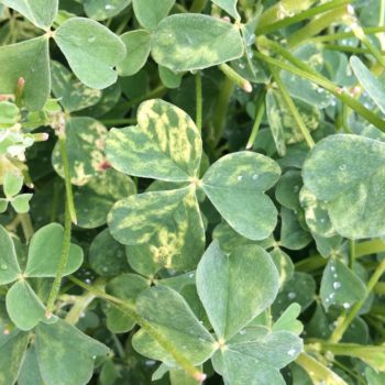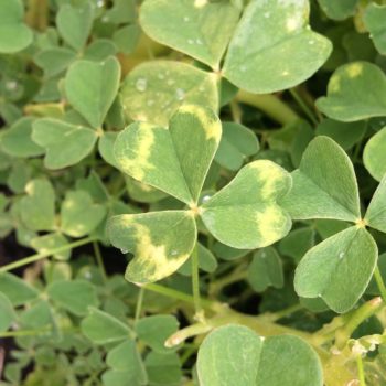 I recently spotted virus symptoms of a sort that I haven’t seen before on an oca plant. Although oca is frequently infected with several different viruses, they are typically asymptomatic. This plant had some lower leaves with obvious yellowing and mosaic and some leaf tip browning. I ran it through a few ELISA tests for potato viruses without result and then sent off some leaves for further testing. They came up positive for Cucumber Mosaic Virus. CMV is a common plant virus with a very wide host range. I scanned the literature and found no previous reports of it infecting oca, but there is a report of it infecting Oxalis corymbosa (Sheikh 2013).