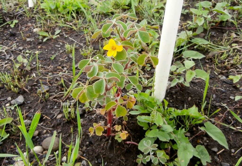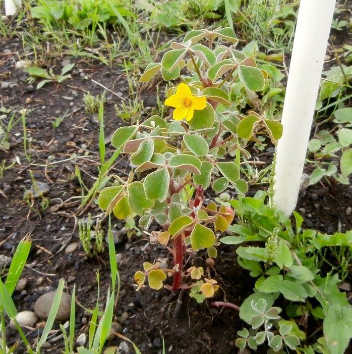 Flowering OE Orange oca plant in an embarrassingly weedy patch