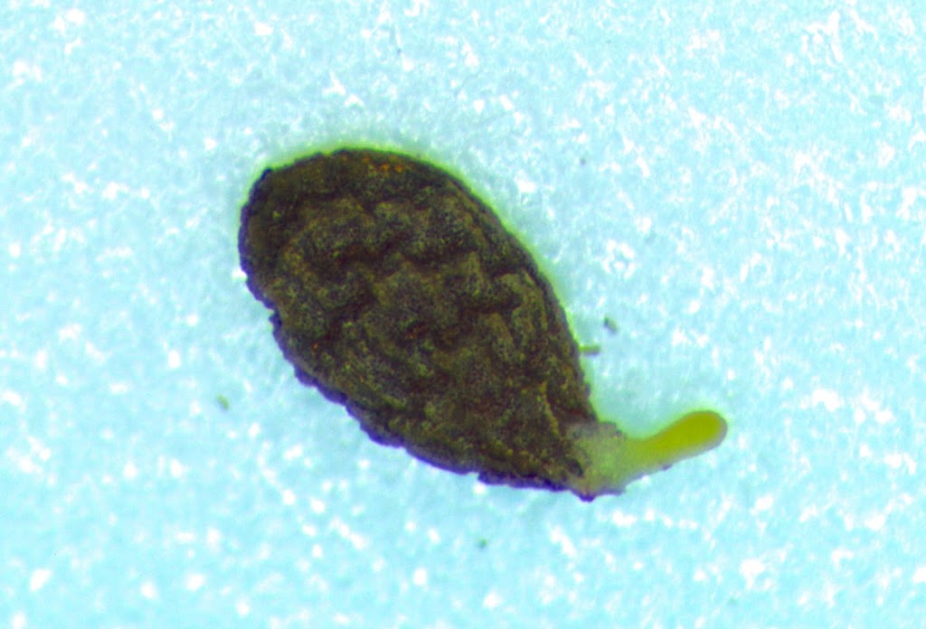 The picture shows an oca seed from the plain water group at 40 hours. It has germinated and the root tip is protruding. There are a few seeds in each group at this stage, although most are not this far along.