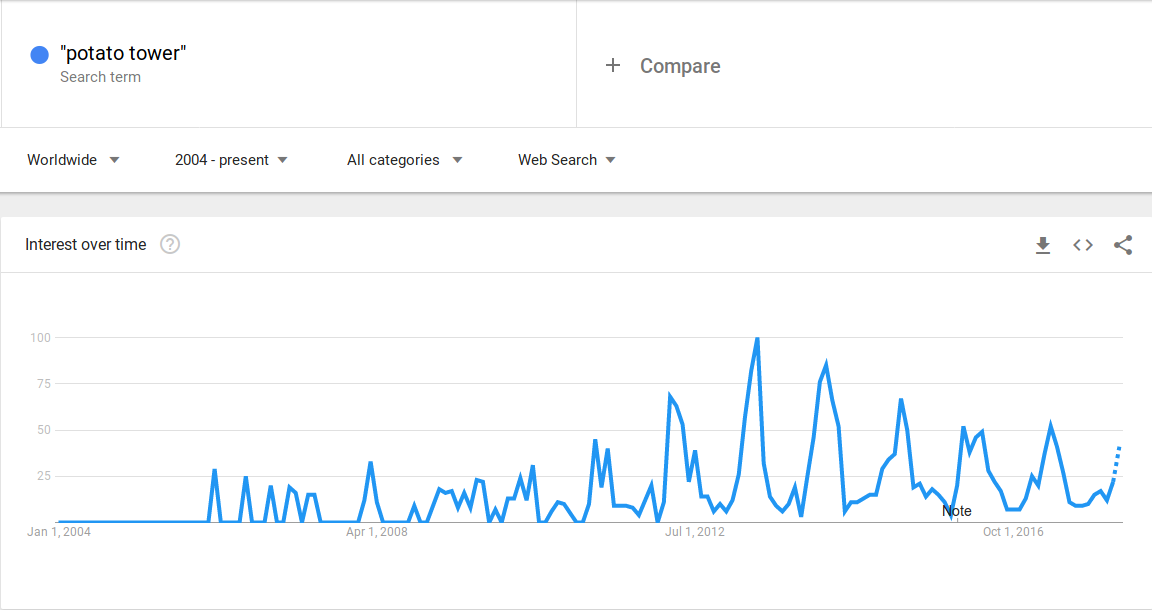 The term “potato tower” first started to show up on the Internet on Usenet in the 1990s, but it wasn’t a common term.  Through the 1990s, there are more than a hundred mentions of growing potatoes in tires for every mention of potato towers.  Potato towers came into the Internet consciousness in 2006 and really started to take off in 2012.  Google Trends shows the frequency of these search terms over time: