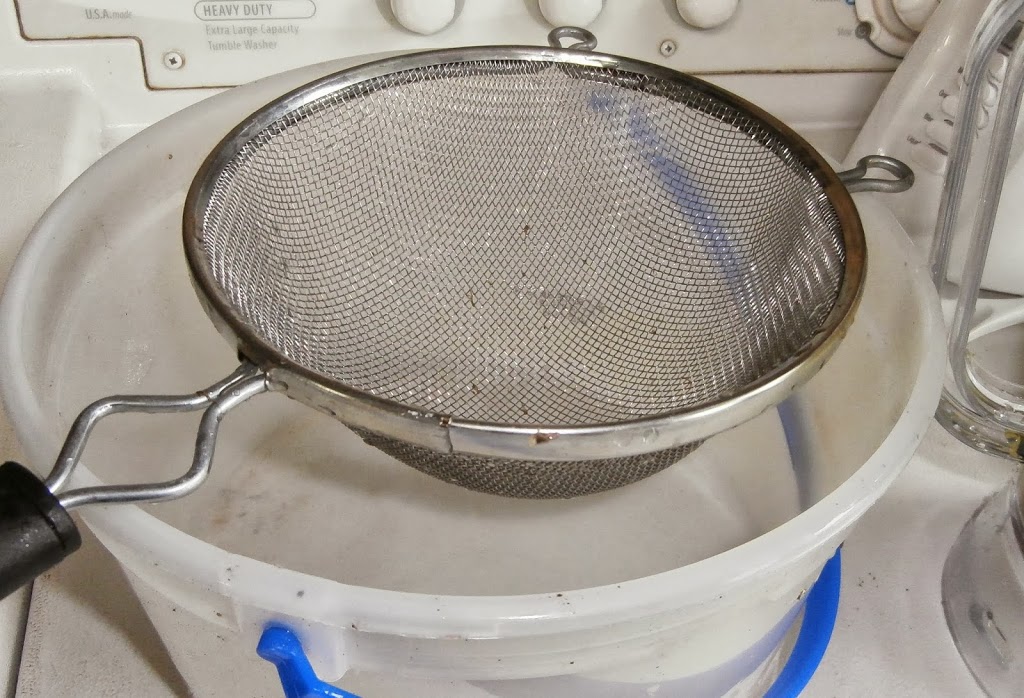 Rest the strainer on a catch container. Dump the blended berries into the strainer and run water through the mass until all the seeds have been washed into the container. You might need to run a lot of water. I use a three gallon bucket for a catch container.