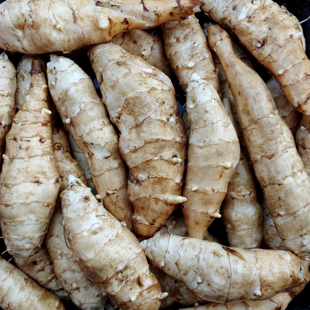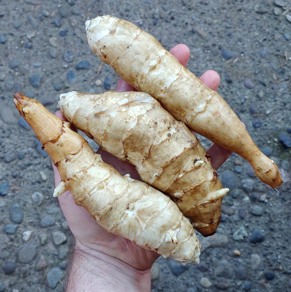 Normally, I offer sunchoke tubers in packets of three, but a lot of these tubers are really big, so you might get two instead. Even with two tubers, you could easily cut them up for half a dozen plants or more.