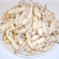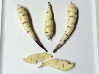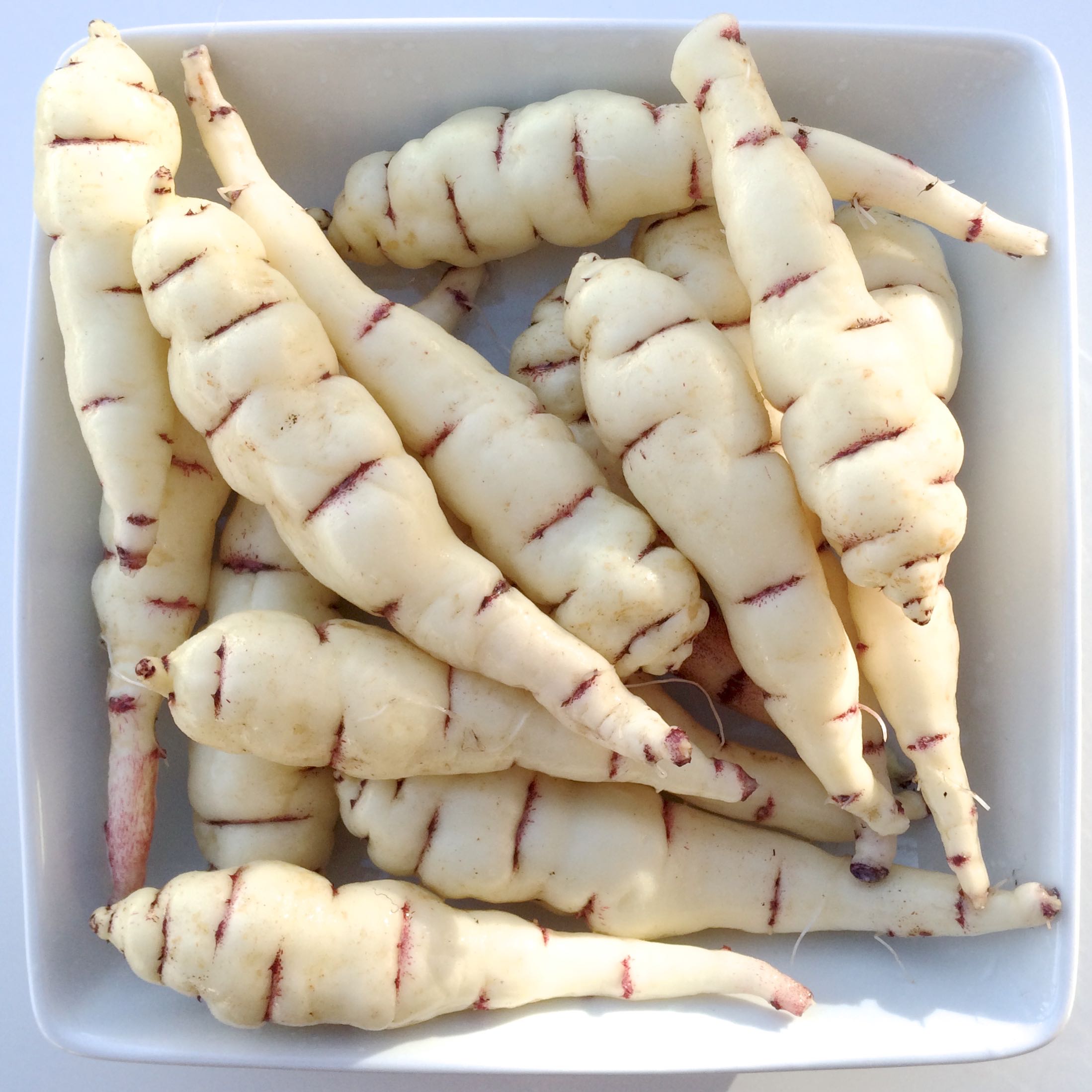 Blanca is an heirloom variety, probably originally from Colombia. It is also sold under the names Pilifera (which is technically the name of a botanical variety, which is different than a cultivar), Sidney, and Yurac-anu. This is the most widespread mashua variety in the United States, where it is commonly sold without a varietal name.