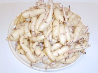 Early to emerge in the spring. Plants are tall on trellis, reaching ten feet or more. This variety has a high yield, with plants on trellis producing 10 pounds or more. Tubers form early but don’t bulk up rapidly, so it needs a mild fall to reach its maximum. This is a fall flowering variety. All sources of this variety that I have tested have been positive for a Potyvirus.