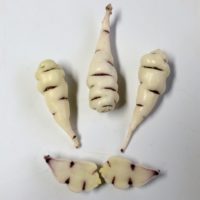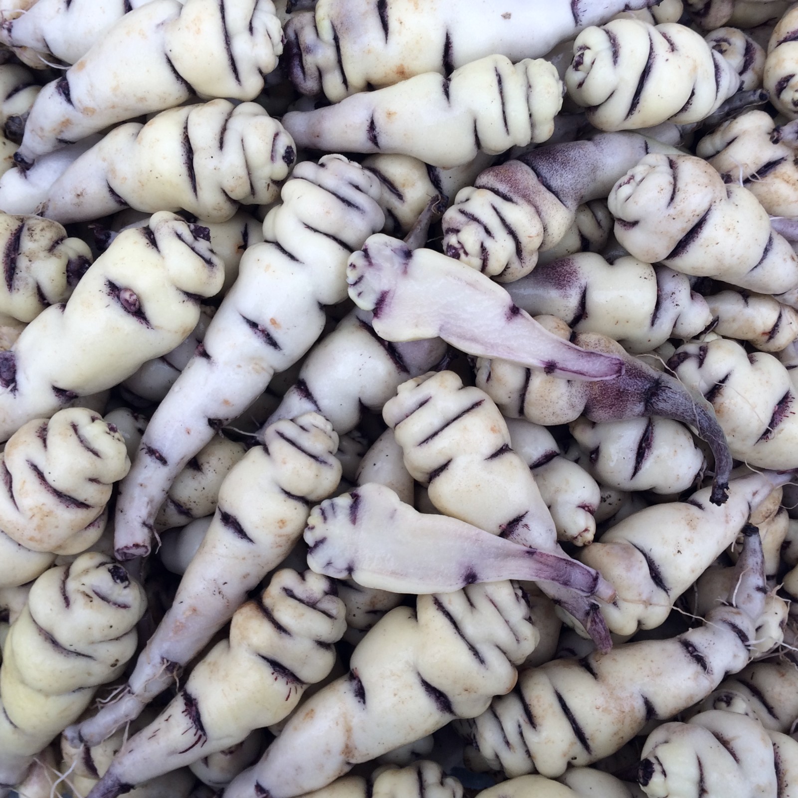 Early to sprout and emerge in the spring. Plants are intermediate in height, reaching up to eight feet on trellis. Maximum yields reach ten pounds or more. Most tubers range between four and six inches in length, although they can be quite a bit larger. A fall flowering variety.
