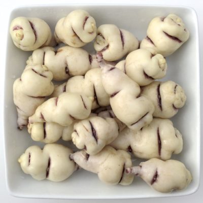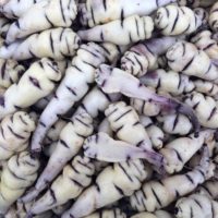 Bogotá Market is an unusual tasting mashua. It lacks any cabbagey flavor and is slightly sweet, but it also has a bit of tartness, which is not common in mashua. The cooked texture is soft. The color darkens when cooking, particularly around the eyes.