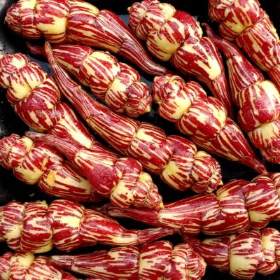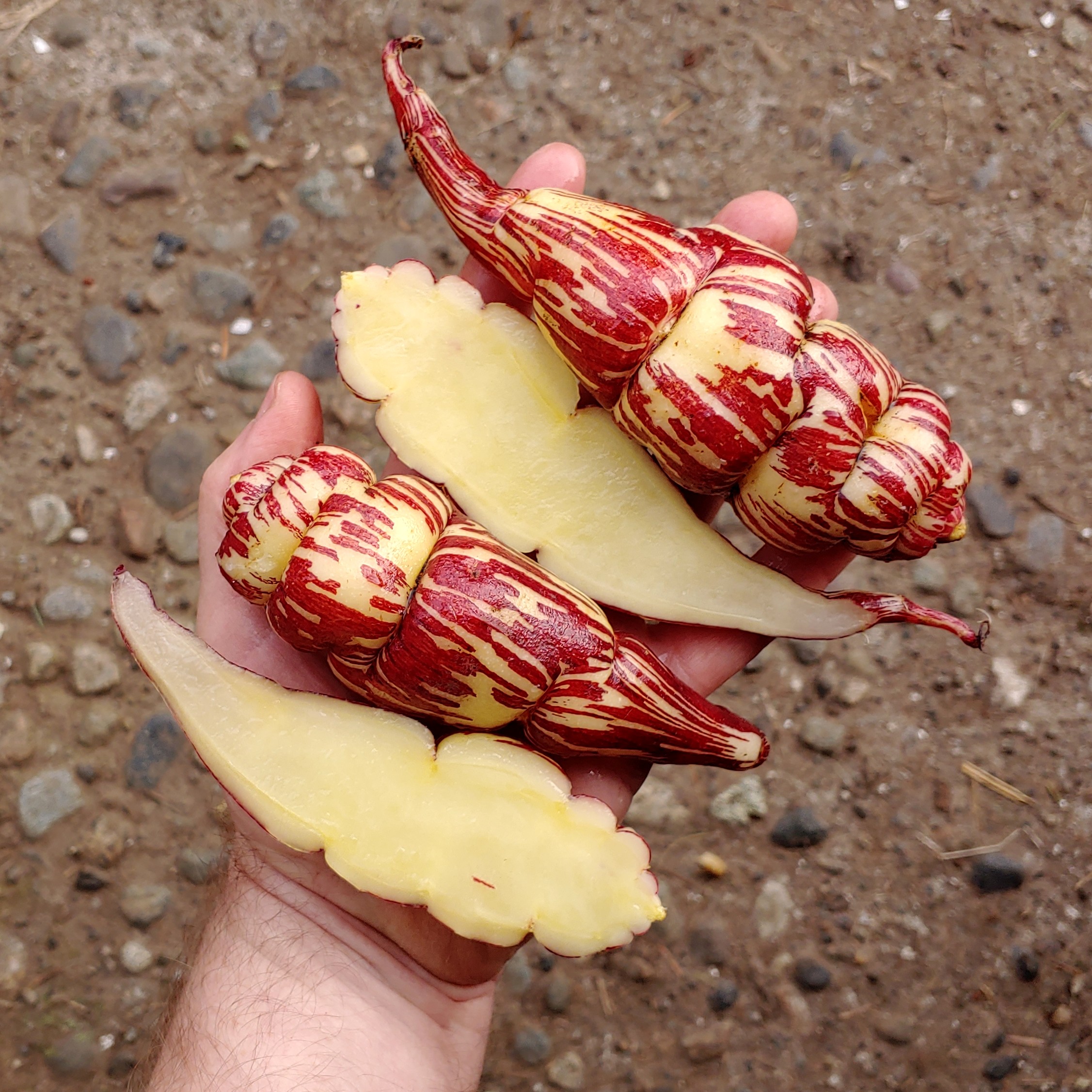This is one of the most spectacular looking mashuas that I have seen. The flavor, unfortunately, doesn’t match the incredible appearance. It’s not bad; it just isn’t a variety that I would normally choose to eat with so many other options. It is a bit cabbagey, slightly flowery, and non-sweet. The texture is a bit watery. It will probably perform better in a wet dish like a stew than eaten plain.