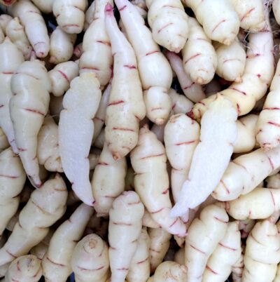 Copalis is a great beginner mashua, as it has a very mild flavor. It is slightly sweet with almost no cabbagey flavor and the flesh holds together at typical cooking duration (30 minutes at 350 degrees F for large tubers). I find this one is even palatable raw in salads as long as you don’t overdo it. The tubers are white with pink eyes and do not darken when cooked.