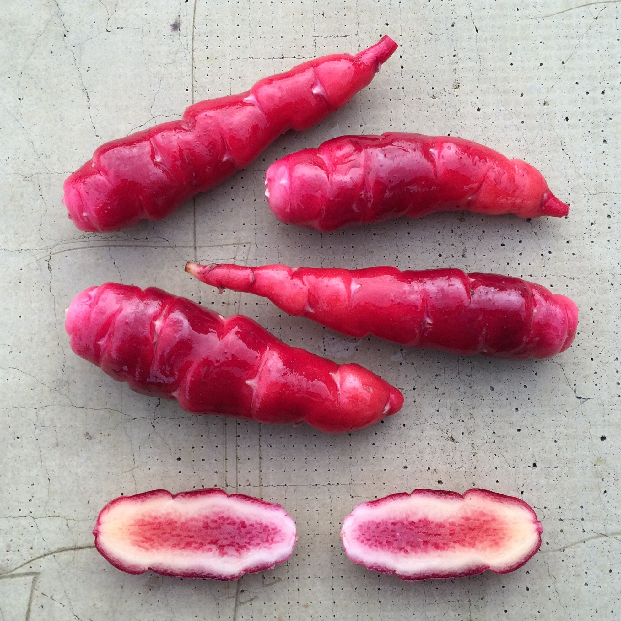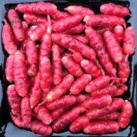 This lovely variety was selected by one of our customers from our true oca seed. It has the largest average tuber size of any of the varieties that we carry with long-styled flowers, so I expect that it will be valuable for breeding. Beyond that, the tubers are a very pretty red color, with a core of red flesh as well. The flavor is moderately acidic.