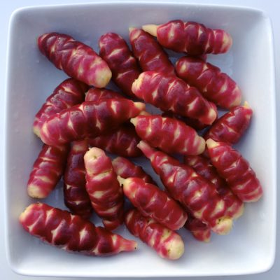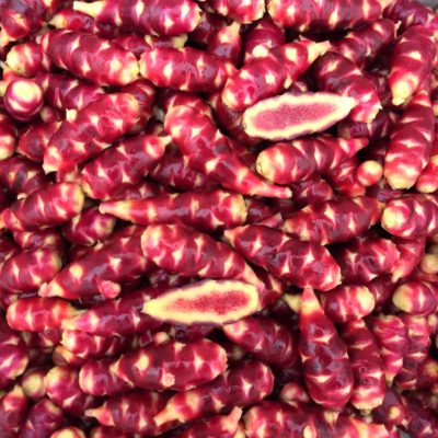 Bolivian Red slightly sweet but not tart, a combination that often reminds me of things like squash and sweet potato, although it doesn’t really taste like either one. The cooked texture is soft. Although it loses some color with cooking, it does retain quite a bit of it and remains red. This is a very attractive variety for raw use. When sliced, you get red and yellow discs, which look great in salads.