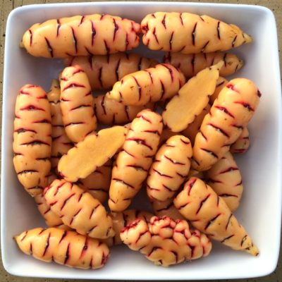 This is a lovely heirloom variety was collected in the Lake Titicaca region in the 1990s. The peach to orange skin color is not common in oca. Flavor is just slightly acidic, kind of a potato/carrot combination, I think. Very good yields. I think this could become one of our most popular varieties. A moderate flowerer with fair seed set.